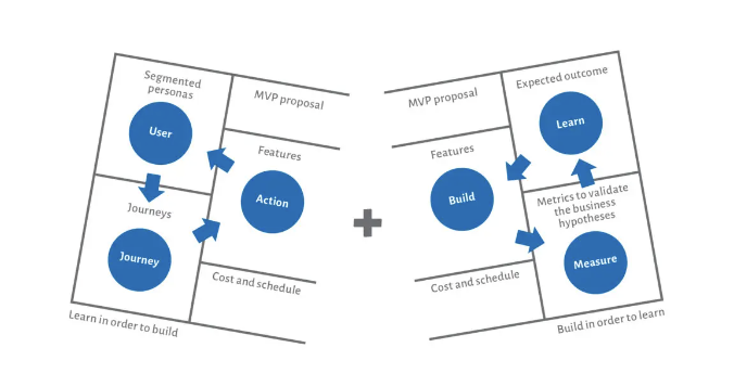 MVP 캔버스에서는 린 스타트업 요소와 디자인 씽킹 요소 그리고 비즈니스 방향성을 갈음하는 요소들이 한 곳에서 보여집니다.