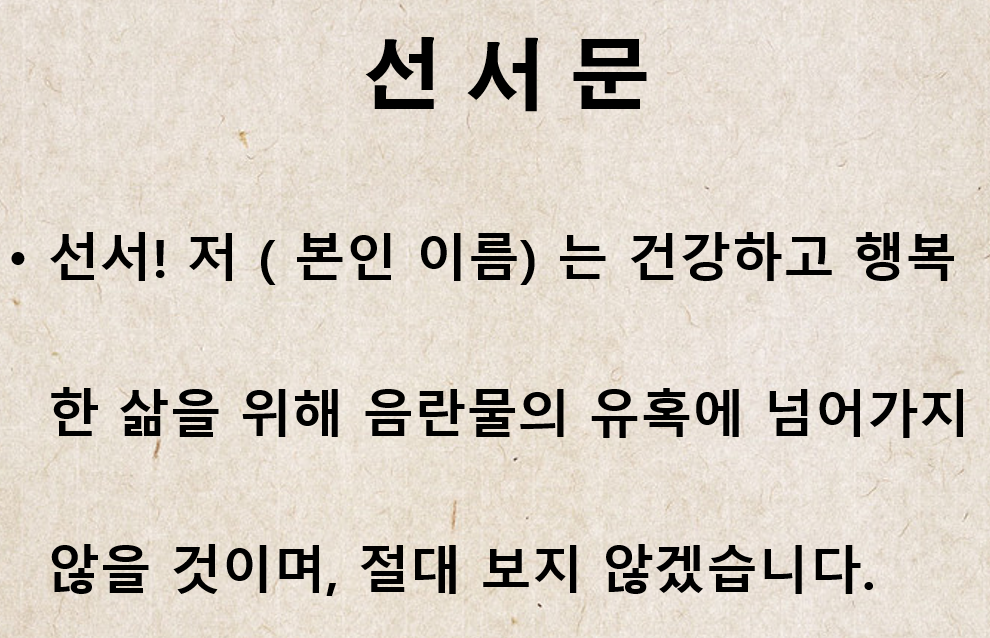 마지막 정리활동으로 다 함께 선서문을 읽으며 다짐하는 것으로 수업을 마무리 한다.(얘들아. 선생님이 아무리 가르쳐주어도 음란물이 보고 싶은 친구는 보겠지. 하지만.. 그 책임은 모두 너희들 각자가 지는 거야 라는 은근한 협박과 함께 수업 마무리!!!!)