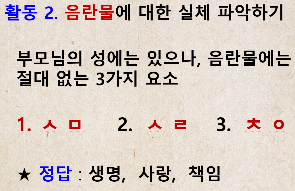 부모님의 성에는 있으나 음란물에는 절대 없는 세 가지 요소는 초성게임으로 맞춰보도록 한다.