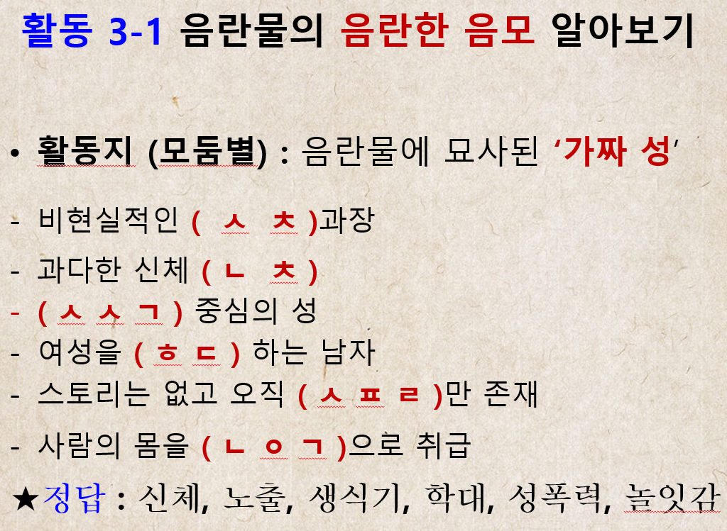 그럼 음란물이 우리에게 노리는 '음란한 음모'에 대해 알아보자(이것도 초성게임으로! 맞추는 친구들에게 비타민은 필수!) 이렇게 활동 3까지 마무리하고 나면 음란물의 명확한 실체를 파악하게 되고, 음란물의 해로움을 깨달아 옳고 그름을 판별할 수 있는 가치관까지 정립할 수 있다.(제발! 그럴 수 있기를....)