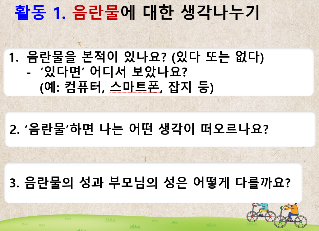 우선 첫 번째 활동으로 '음란물에 대한 생각 나누기'를 해본다.