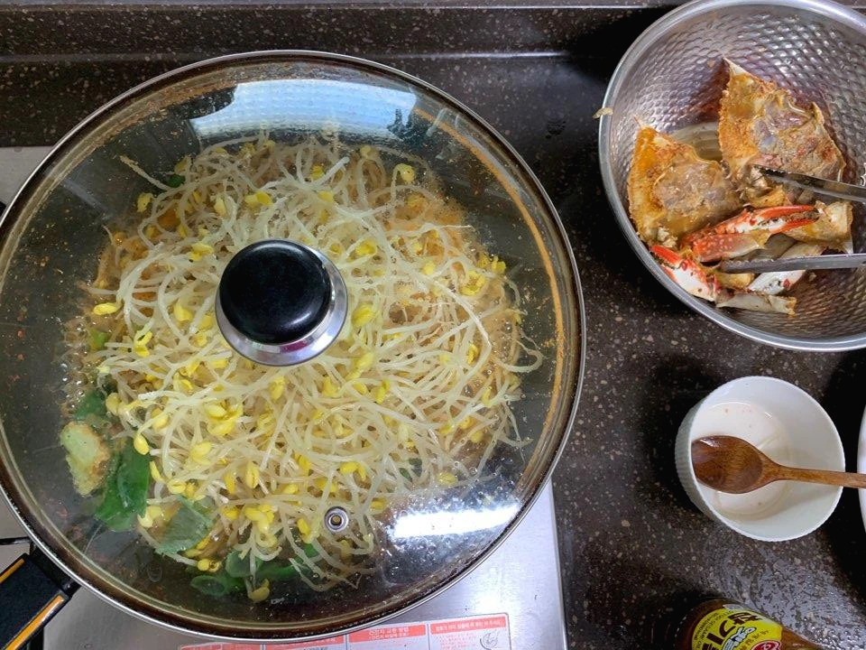 꽃게가 익으면 덜어내고 국물에 콩나물과 전분을 탄 물을 넣고 끓이고