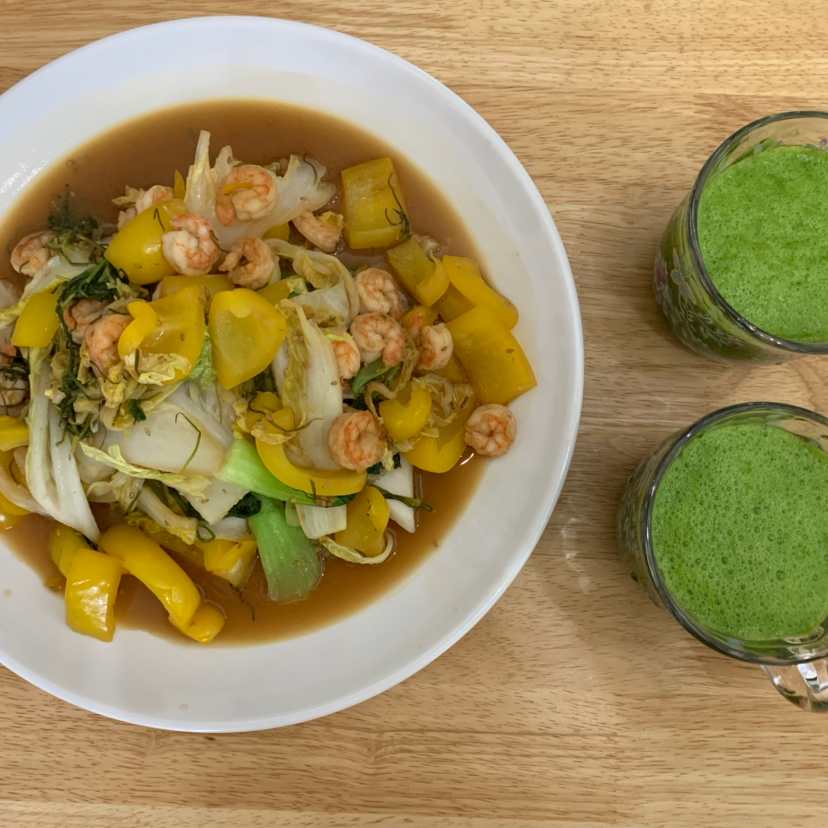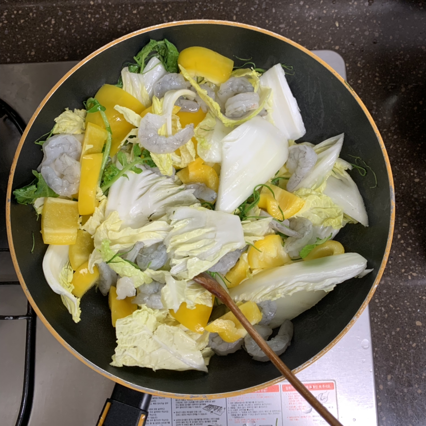 점심은 들깨 간장소스로 배추 새우볶음 샐러드!