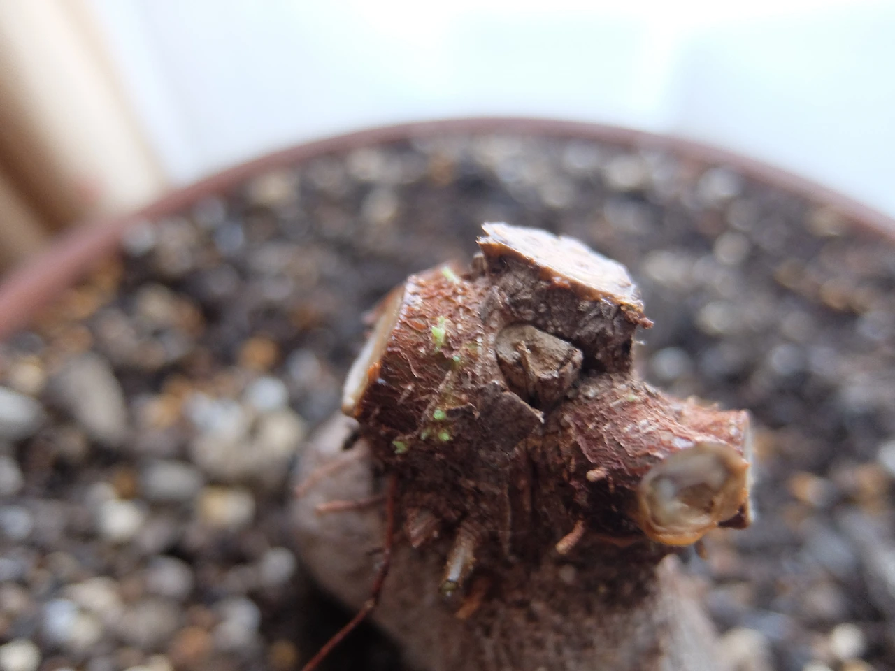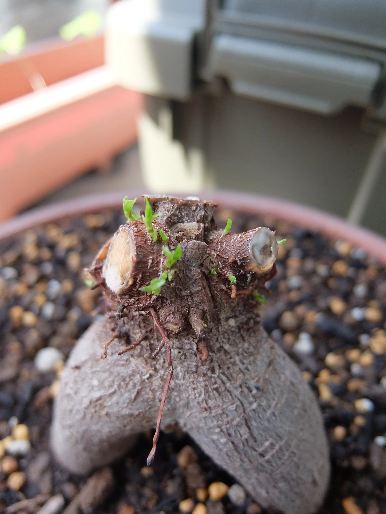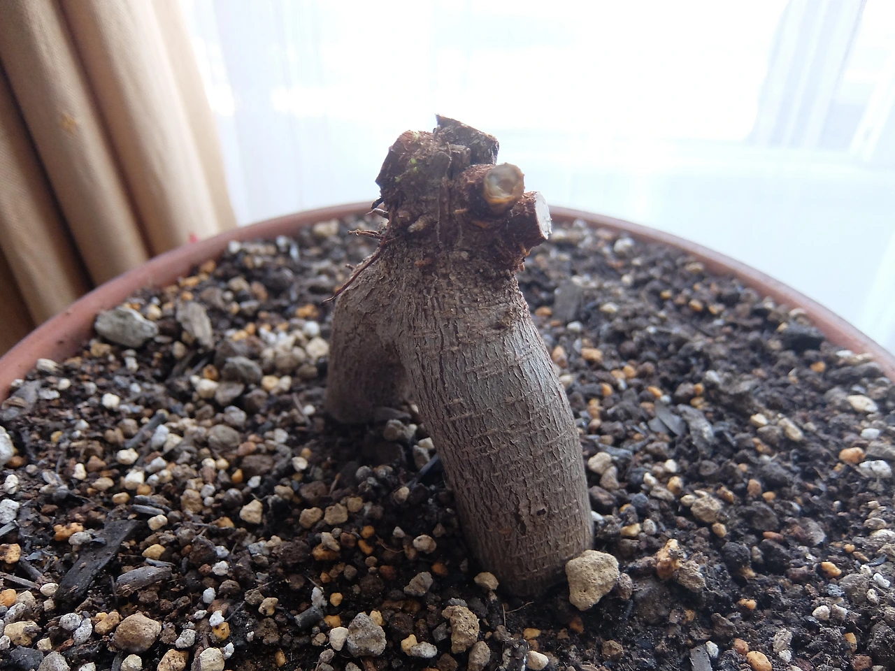 무작정 커지는 게 결코 좋은 게 아니란 걸 깨닫고 하루빨리 가지를 쳐내기로 마음먹었다. 남편은 정이 많이 들었는지 가지 하나조차 쳐내기 미안하다며 가지치기를 미루고 미뤘다. 그렇지만 불균형하게 비대해졌을 때 가장 피해를 보는 건 이 녀석이라 날이 더 따뜻해지기 전에 날을 잡았다. 어느 가지를 쳐내야 할까 이것저것 알아보고 고민하다가 이 상태면 어느 걸 쳐내도 별로 좋아질 거 같지 않다는 결론에 다다랐다. 이왕 자를 거면 밑가지를 두껍게 만들어서 튼튼하게 길러보자 마음먹고 가지를 전부 다 쳐내기로 했다. 그래도 1년 동안 기른 건데 다 잘랐다가 이대로 죽으면 어쩌지 걱정도 됐지만 이 녀석의 생명력을 믿어보기로 했다. 어른 허리만큼 자랄 때까지 1년이란 시간이 걸렸는데 잔가지까지 전부 다 쳐내는 건 한순간이었다. 아깝다는 마음을 쉽게 져버릴 순 없었지만 이 녀석은 이제야 숨통이 트인 게 아닐까, 너무 늦게 잘라줘서 미안한 마음까지 들었다. 녀석의 크기가 내가 쏟은 정성에 비례한다고 믿었던 건 그저 자기만족에 불과했던 건지도 모르겠다. 정작 녀석에게 정말 필요했던 부분에는 미처 신경 써주지 못했다. 그렇게 가지 하나하나에 녀석의 대한 미안함과 반성을 담아 잘라냈고 그 결과 민둥머리로 다시 태어났다. 열흘 정도 감감무소식이어서 제대로 자른 게 맞나 엄청 걱정했는데 조금씩 잎이 돋기 시작했다.
