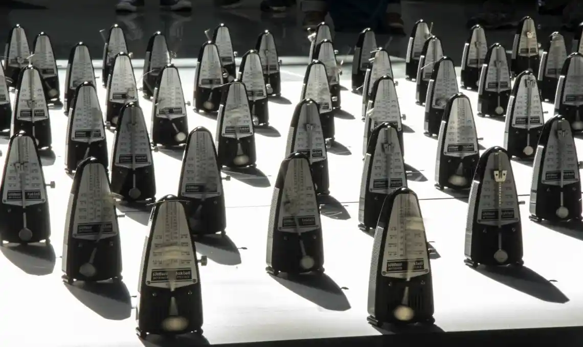 그러나 이 작품에서 그 관계는 전복된다. 음악의 보조 수단은 여기서 핵심 악기가 된다. 보조 수단으로서의 메트로놈은 음악의, 연주의 완성도를 높이도록 ‘돕는’ 도구다. 메트로놈은 연주자의 몸이 원하는 시간과 속도에 적응하는 순간 그 쓰임을 다한다. 그러니 연습실에는 있지만, 무대에서는 계획적으로 소거되는 것이 바로 메트로놈 소리다. 그런데 무대 아래 연습 노동을 상징하는 바로 그 메트로놈 소리가 “교향시”에서는 무대 위 음악 자체가 된다. 메트로놈이 악기가 된다는 사실은 음악의 보조 수단이 악기가 된다는 것 이상의 의미를 갖는다. 메트로놈은 무대 아래 숨겨진 연주자의 시간을 관객에게 정면화한다. 메트로놈 소리는 무대에 드러나지 않던 연습실, 숨겨진 연주자의 시간, 그 숙련의 과정 같은 것으로 관객을 불러들인다.