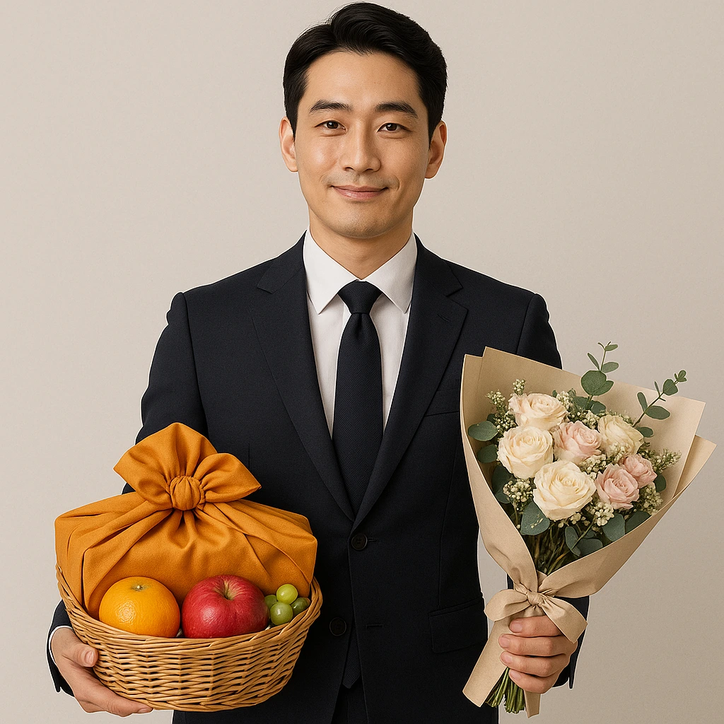 정장 차림에 과일바구니와 소고기,