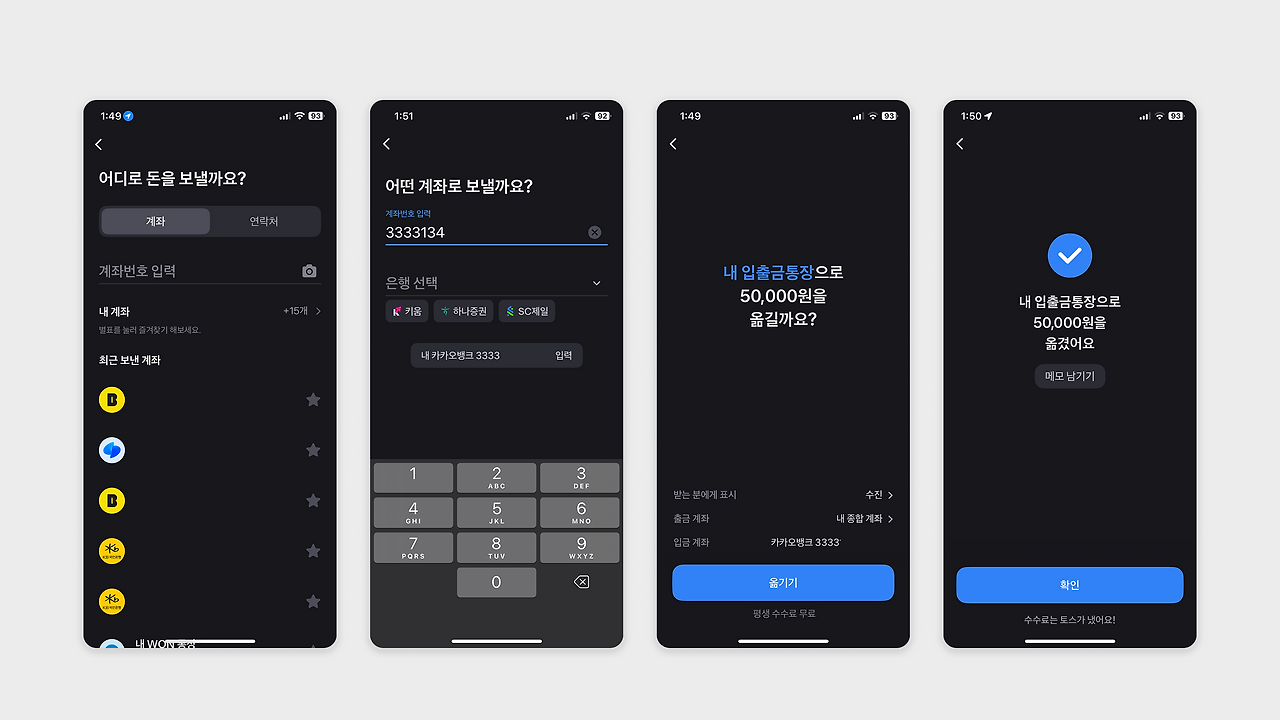 : 계좌번호 자동완성, 최근 보낸 계좌, 연락처 연동 등을 통해 복잡한 입력 과정을 생략