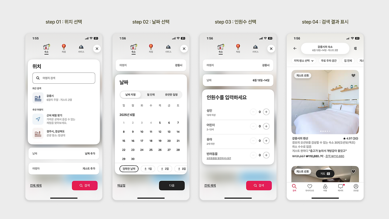 : 숙소 위치, 날짜, 인원수의 단계를 논리적으로 나눠 복잡성 분산