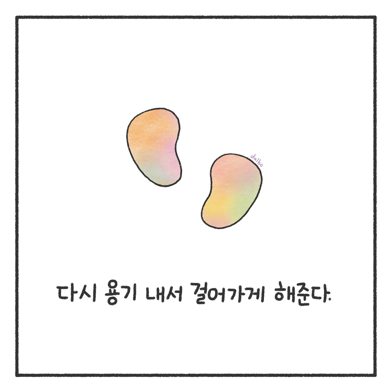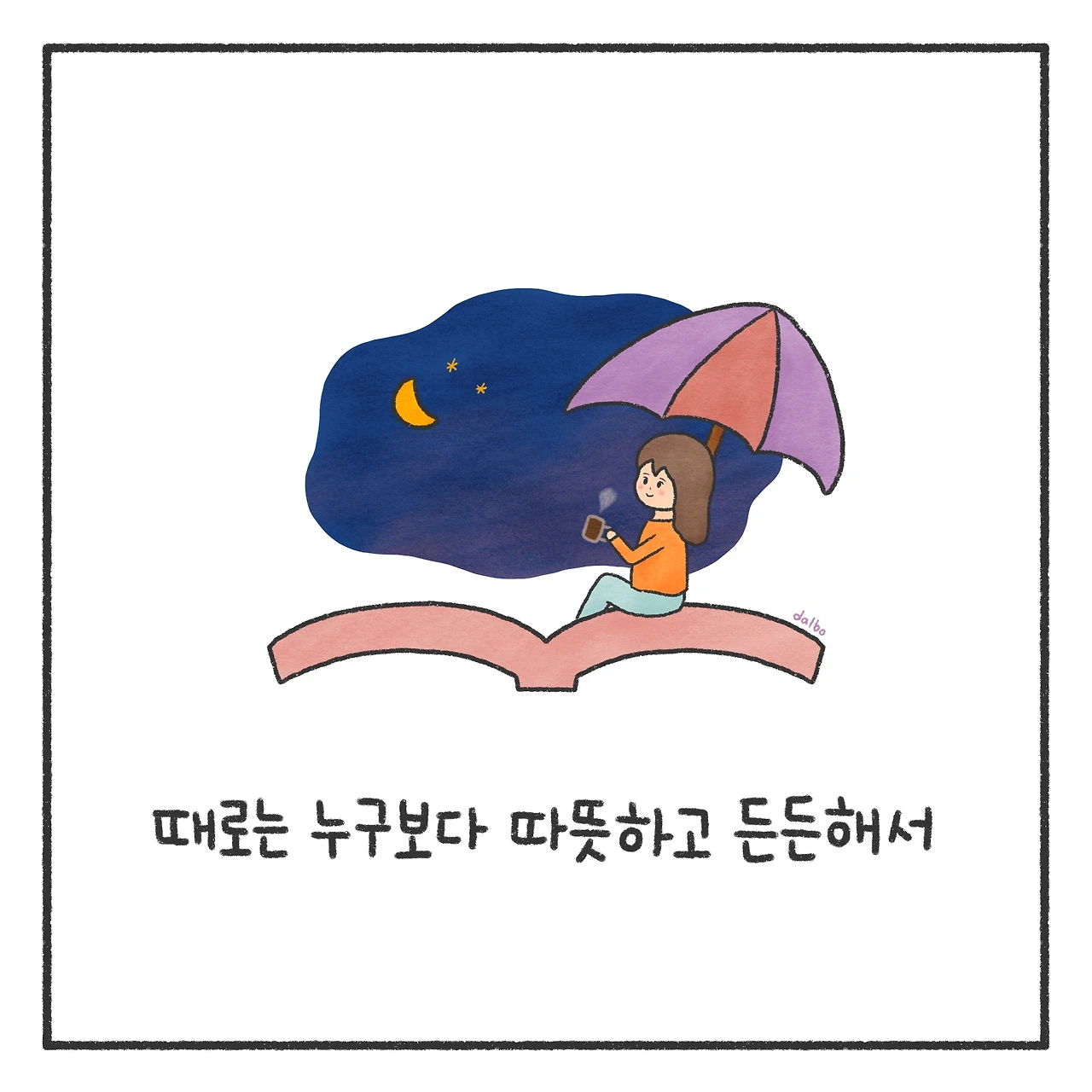그 당시에 내 삶의 키워드가 ‘위로’였는데, 그림책을 통해 큰 위로를 받고 나니 나도 그림책을 통해 사람들을 위로하고 싶다는 꿈이 생겼다. 그전에도 그림은 그려왔지만, 받은 위로를 전하고 싶다는 결심이 지속할 힘을 더해주었다. 그림을 계속 그리는 게 맞을까 하는 생각이 나를 사로잡을 때가 종종 있다. 그런 생각이 커지면 한동안 그림과 멀어지기도 한다. 그림과 멀어져 있다 보면 그림책이 나를 일으켰던 순간이 생각나서 다시 펜을 들게 된다. 한 걸음 한 걸음 쉽지는 않지만, 누군가를 다독이는 그림을 그리는 날이 오기를 바라며 오늘도 펜을 든다.