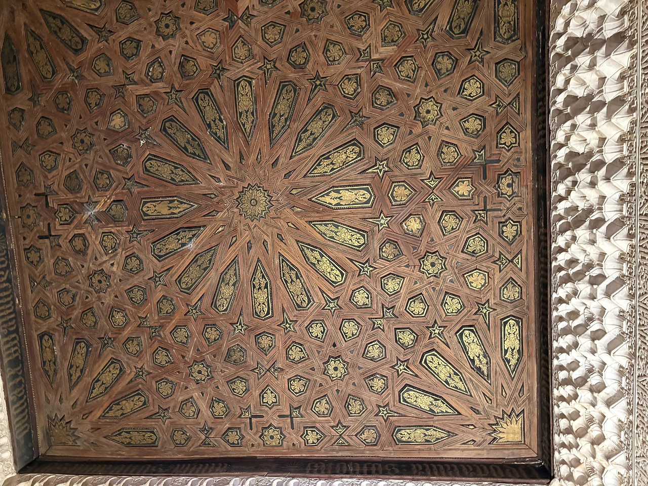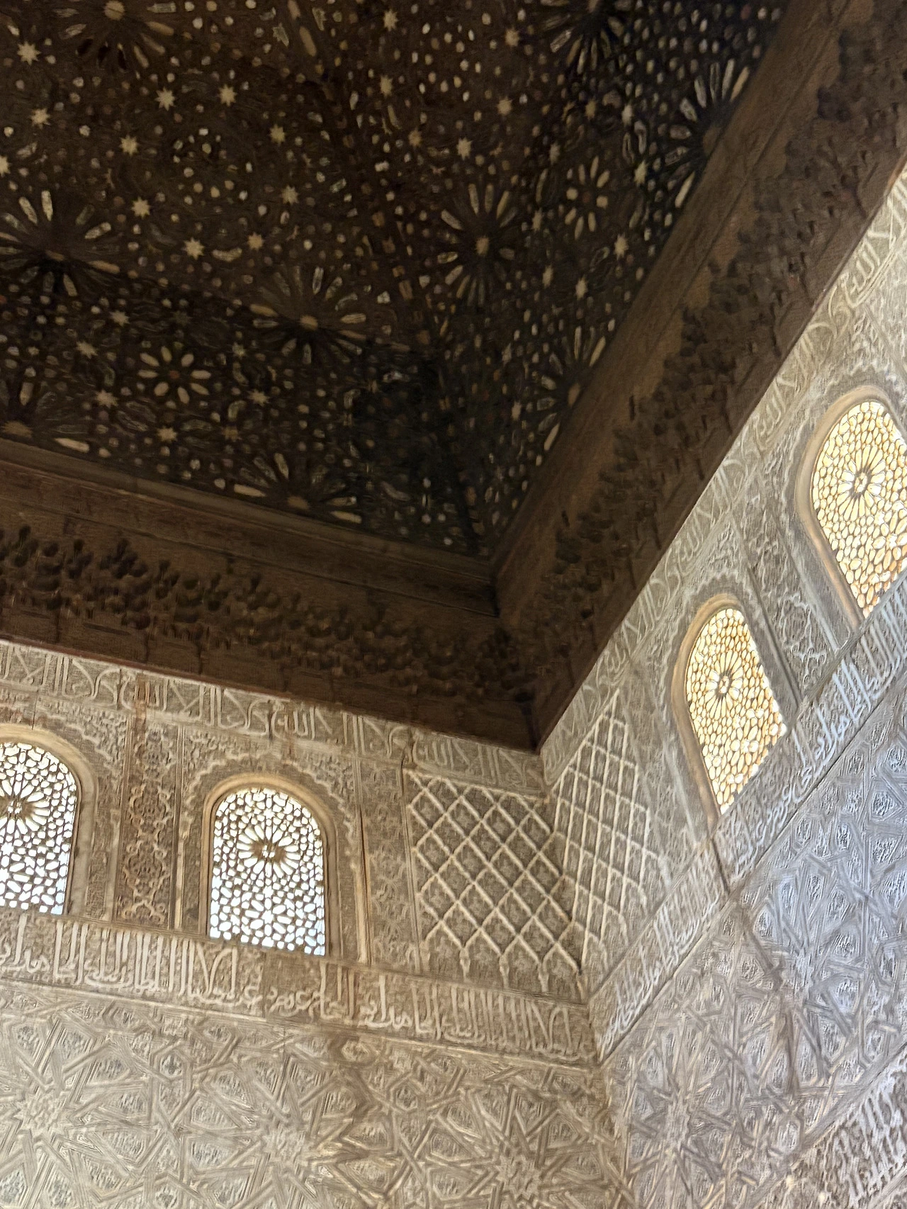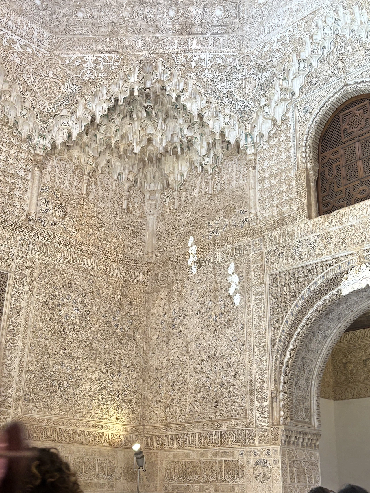 웬만한 유명장소는 가이드투어를 진행했는데 알함브라 궁전은 마지막까지 고민하다 가이드 투어를 선택하지 않았다. 워낙 유명한 곳이니 방마다 챗 지피티의 도움을 받아 설명을 듣기도 쉬웠고 우리 가족의 관심도에 따라 어느 곳은 여유 있게 어떤 곳은 빠르게 지나갔다. 가이드 투어를 오신 분들은 가이드를 따라가며 설명을 듣기에 여념이 없었지만, 우리는 중간중간 놓여있는 의자에 앉아 천장에 그려진 패턴을 올려다보고, 챗지피티의 설명에 따라 어디가 대칭점인지도 찾아보곤 했다. 여유가 있으신 분들은 가만히 앉아 온방을 이루는 전체 디자인을 찬찬히 둘러보고 느껴보시기를 권유드린다. 그리고 한국 단체 관광객들이 워낙 많다 보니 지나가는 중간중간 의도하진 않았지만 짧은 귀동냥도 가능하다. 물론 가이드가 없다 보니 동선을 잘 못 잡아 길을 엄청 돌아다닌 단점도 있으니 각자가 중요하게 생각하는 포인트를 고려해서 신중하게 선택하시기를…. (저는 길을 몇 번 헤매는 바람에 아이들의 항의를 많이 받았어요ㅎ)