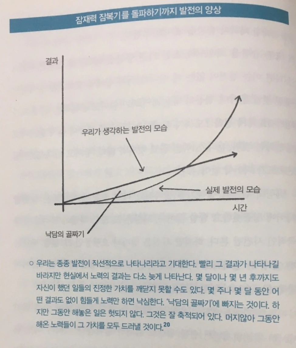 그럼에도 낙담하는 건 지극히 인간적이다. 클리어에 따르면, 인간의 뇌는 자신이 들인 시간과 노력에 비례해 그만큼의 성과를 기대하도록 프로그래밍되어 있다. 그러나 실제 성장과 발전은 그렇게 오지 않는다. 아예 오지 않다가, 더디게 오다가, 슬그머니 올라가는 게 성장이라고, 클리어는 설명한다. 그 차이에서 생기는 것이 '낙담의 골짜기(the valley of despair)'다. 클리어의 책에 나온 아래 그래프를 보면 이해가 쉽다.