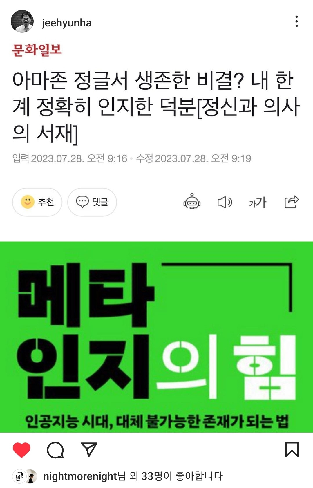 하지현 박사 인스타그램 캡쳐. 항상 잘 읽고 있어요.