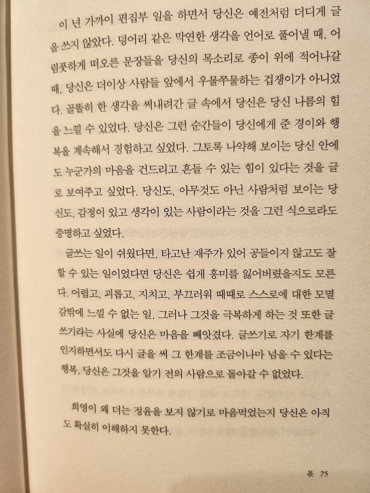 "글쓰는 일이 쉬웠다면, 타고난 재주가 있어 공들이지 않고도 잘할 수 있는 일이었다면 당신은 쉽게 흥미를 잃어버렸을지도 모른다. 어렵고, 괴롭고, 지치고, 부끄러워 때때로 스스로에 대한 모멸감밖에 느낄 수 없는 일, 그러나 그것을 극복하게 하는 것 또한 글쓰기라는 사실에 당신은 마음을 빼앗겼다."(최은영 작가 소설집 『아주 희미한 빛으로도』 75쪽 발췌, 문학동네)