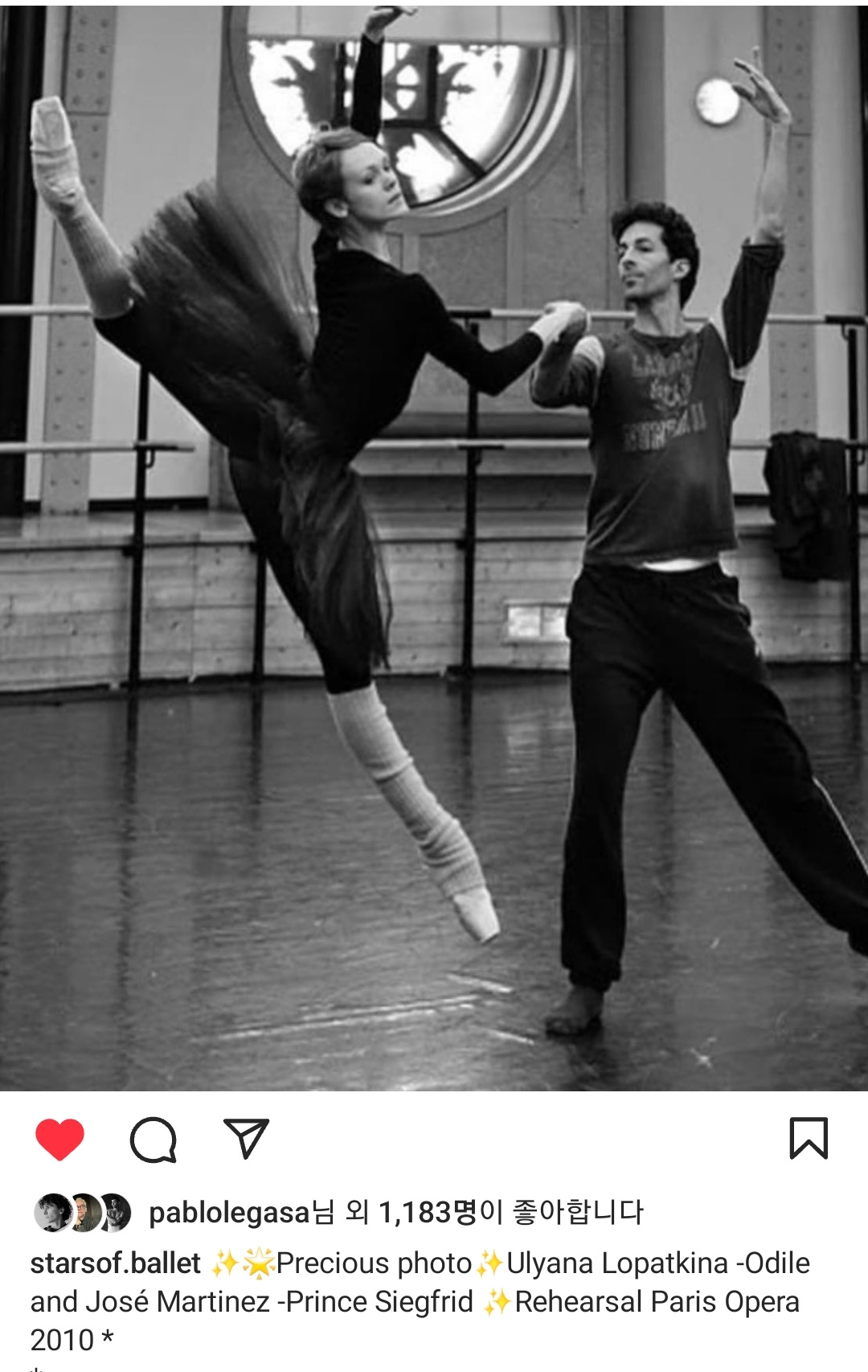 인스타그램 Stars of Ballet 계정에서 가져온, 율리아 로파트키나 사진. 현 파리오페라발레단 단장인 호세 마르티네즈와 리허설 중이다.