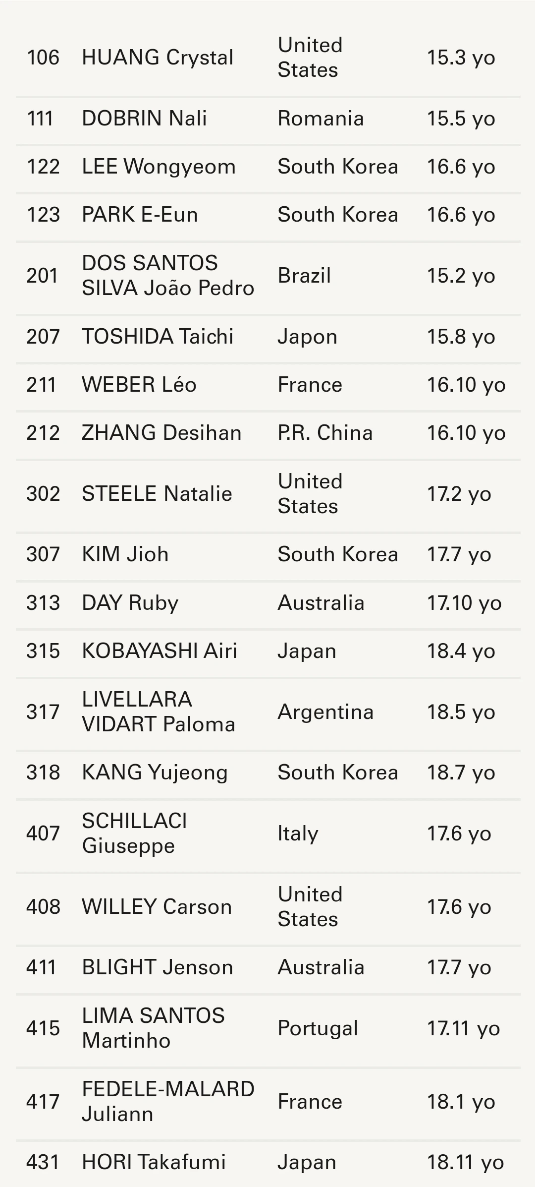 그리고 이 글을 쓰는 2월 3일 토요일 오전 직전에 발표가 난 파이널리스트 명단. 남녀 통틀어 모두 20명이 선정됐는데, 이중 한국 학생은 무려 4명. 122번 이원겸 학생(선화예고), 123번 박이은 학생(서울예고), 307번 김지오 학생(서울예고), 318번 강유정 학생(선화예고)이다. 박수.