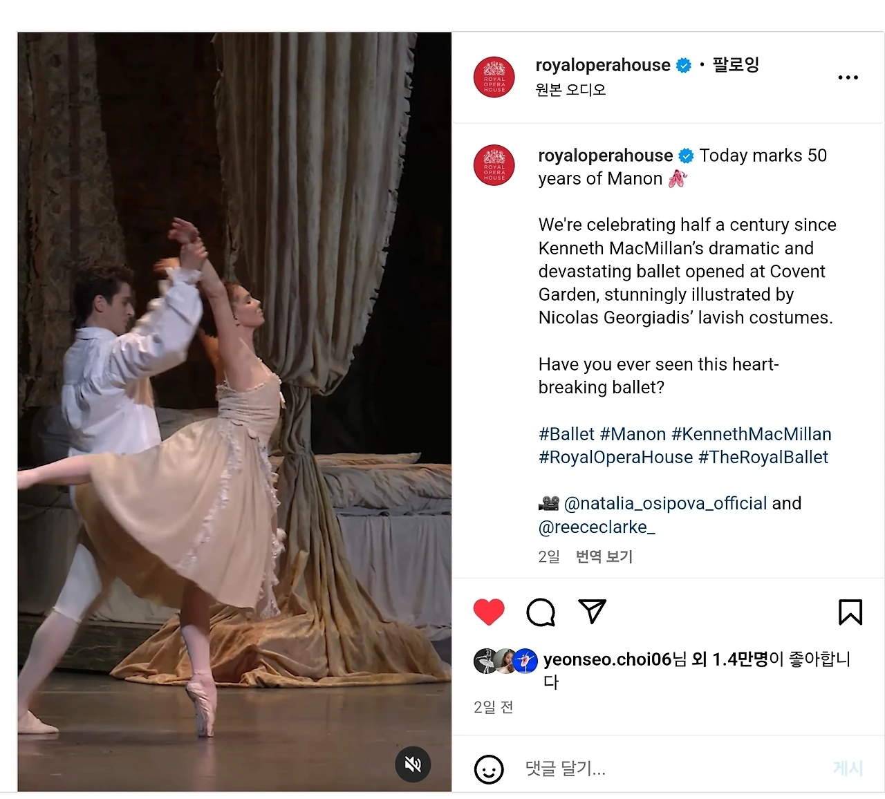 계기,라는 것은 대개, 하늘에서 떨어지지 않는다. 그래서 8일 영국 로열발레단(the Royal Ballet) 인스타그램에 '마농(Manon)' 포스팅이 나왔을 때 나는 쾌재를 불렀다. '마농'에 대한 글을 쓰고 싶던 차, 계기가 하늘에서 떨어진 셈이었으므로. 포스팅 스크린샷은 아래와 같다.
