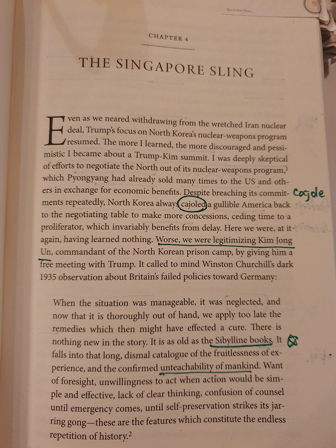 그나저나, 진짜 괴로운 부분은 Chapter 4부터 시작이다. 제목은 ‘The Singapore Sling.’ 2018년 6월 12일 싱가포르에서 개최됐던 1차 북ㆍ미 정상회담의 성사 전후의 막전막후를 소상히 다뤘다. 최근 사임한 정의용 전 청와대 국가안보실장에 대한 이야기가 상세히 나오는 부분도 이거다.