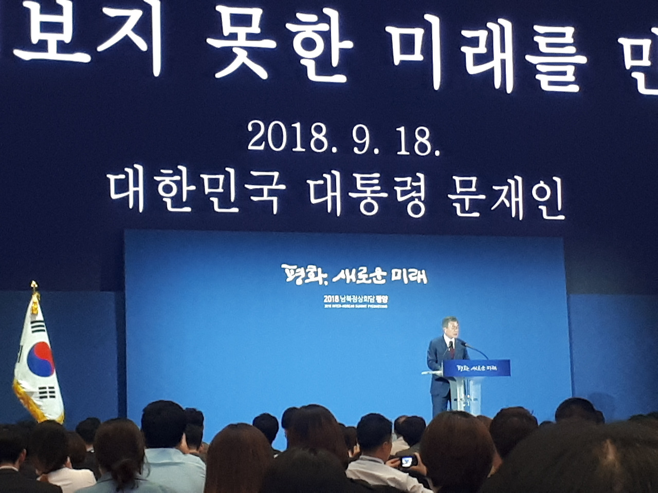 직접 촬영한 사진. 2018년 평양 남북 정상회담 후 서울 동대문 프레스센터에서 기자회견을 하는 문재인 대통령이다.