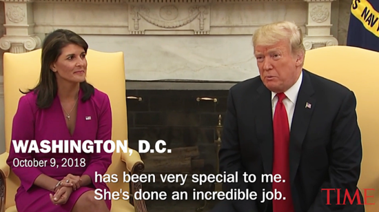 트럼프는 헤일리에 대해 볼턴과 생각이 달랐다. 헤일리 대사는 2018년 12월 사임했는데, 트럼프 대통령은 그를 백악관으로 불러 동석한 채 기자회견을 여는 이례적 장면까지 연출해줬다. “헤일리는 많은 일을 해결해줬고, 그가 곧 다른 자리를 맡아주길 바란다”는 공치사까지 했다. 일각에선 헤일리가 후일 백악관 입성을 노린다는 얘기도 돈다.