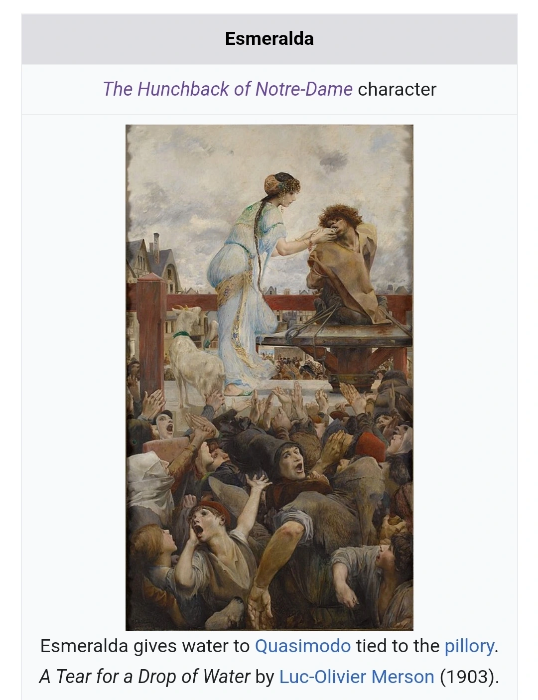 콰지모도에게 물을 건네주는 에스메랄다. 위키 커먼스.