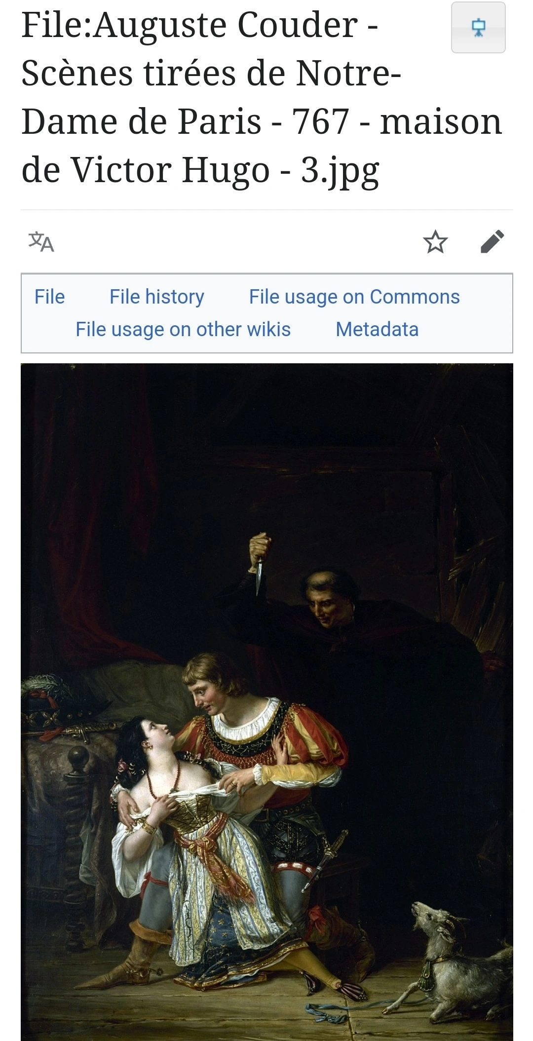 페뷔스와 에스메랄다. 뒤어서 칼로 습격하는 이가 프롤로 주교. 위키커먼스.