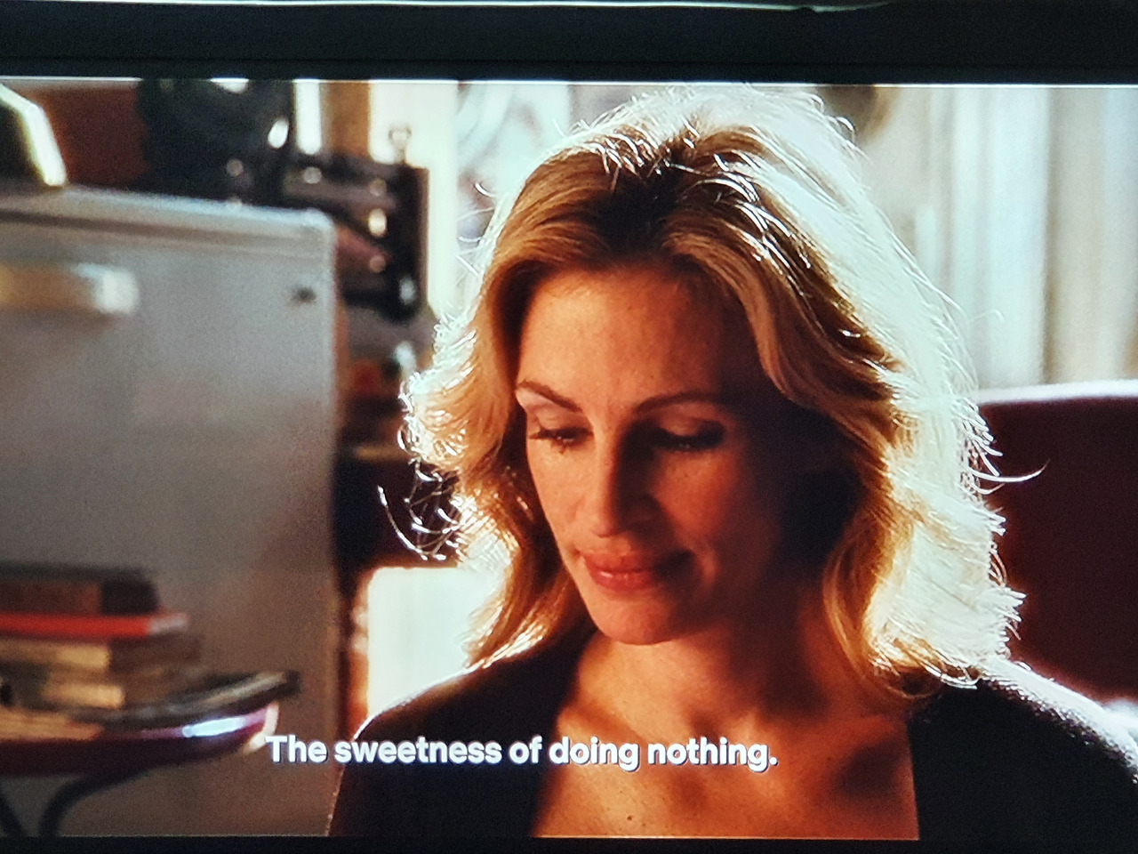영어론 "Sweetness of doing nothing". 즉, "무위(無爲)의 달콤함" 정도로 번역이 될까. 이탈리아 친구 (姓이 ‘스파게티’였다)가 “너네 미국인들은 쉴 줄을 몰라. 맥주 광고에서 ‘이젠 쉴 때야’라고 해야 맥주 한 짝을 사들고 와서 다 마셔버린 후 숙취로 고생이나 할 뿐이지. 우리 이탈리아인들은 말이야, 아무것도 안 하는 달콤함의 달인이라고”라고 하는 장면. ‘미국인’을 ‘한국인’으로 바꿔도 무방하지 않을까.
