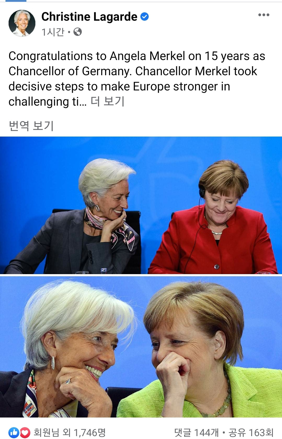 크리스틴 라가르드 유럽중앙은행(ECB) 총재가 22일 올린 메르켈 총리 취임 15주년 축하 포스팅 [페이스북 캡쳐]