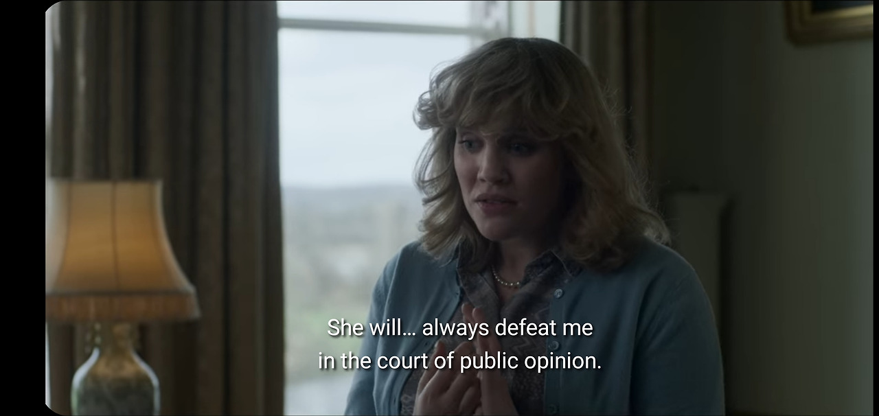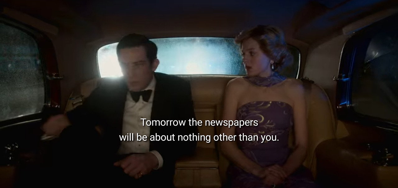 동화 속 주인공이 되려면, 피해자가 돼야 해. 우리가 관계를 공식화해 버리면, 다이애너는 바로 피해자가 되겠지. 동화 vs 현실의 서사 기법에선 동화가 항상 이겨. 그녀는 나를 여론의 장에서 짓밟겠지. 그게 현실이야. 미래의 왕비는 다이애너이고 나는 그저 애인일 뿐.