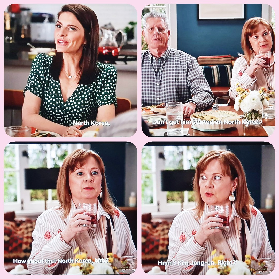 상견례 자리에서 북한 얘기가 나오자 "얘 네 아빠에게 북한 얘기 시작도 못하게 하렴"이라고 했다가 대화가 이상해지자 "북한, 뭐 그 김정은인가 얘기 어때?"라는 장면. [캡처]