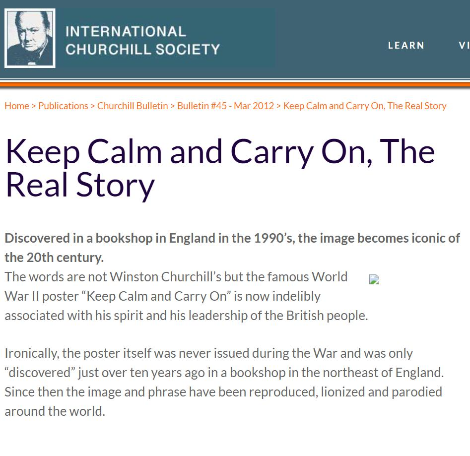 제2차 세계대전 발발 당시 전설적인 영국 총리 윈스턴 처칠이 남겼다는 말로 종종 오해된다. 전쟁이 터지자 흔들리는 민심을 달래기 위해 나온 문구인 건 맞다. 하지만 처칠이 쓴 건 아니다. 처칠 관련 웹사이트에서 “사실은 처칠이 한 말은 아니랍니다”라고 아래와 같은 설명도 해놓았을 정도. 영국 정부가 대국민 홍보 포스터로 제작을 했고, 한 우체국에 붙어 있던 걸 전후 발견했다는 게 정설.