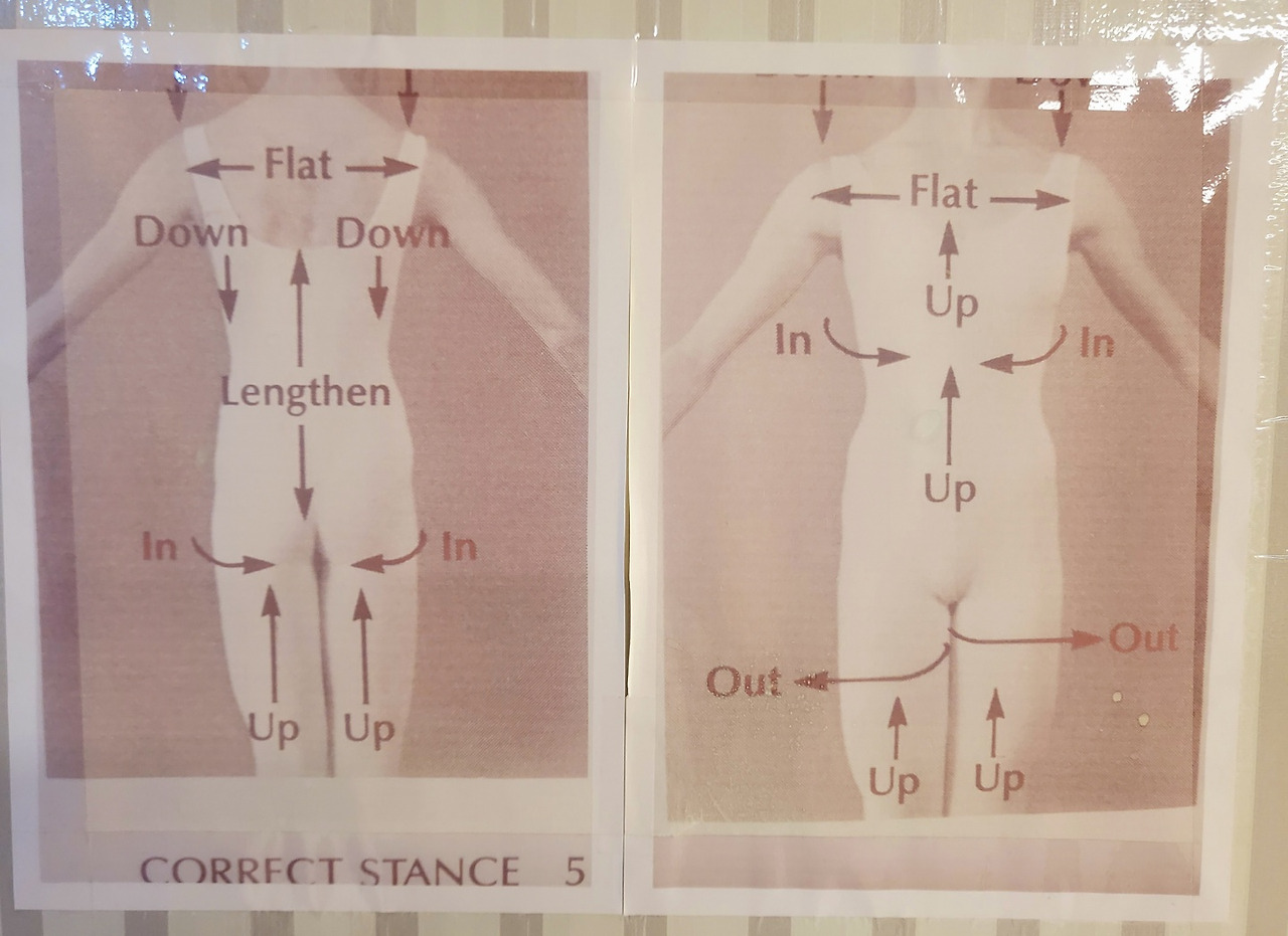 갈비뼈는 안으로 모으고 목을 위로 뽑고 어깨는 내리고 팔은 올리고 등은 내리고 허벅지와 골반과 무릎은 밖으로 향하되(턴아웃) 안쪽 허벅지는 모으고 배 근육은 위로 올리고(풀업) 헥헥.