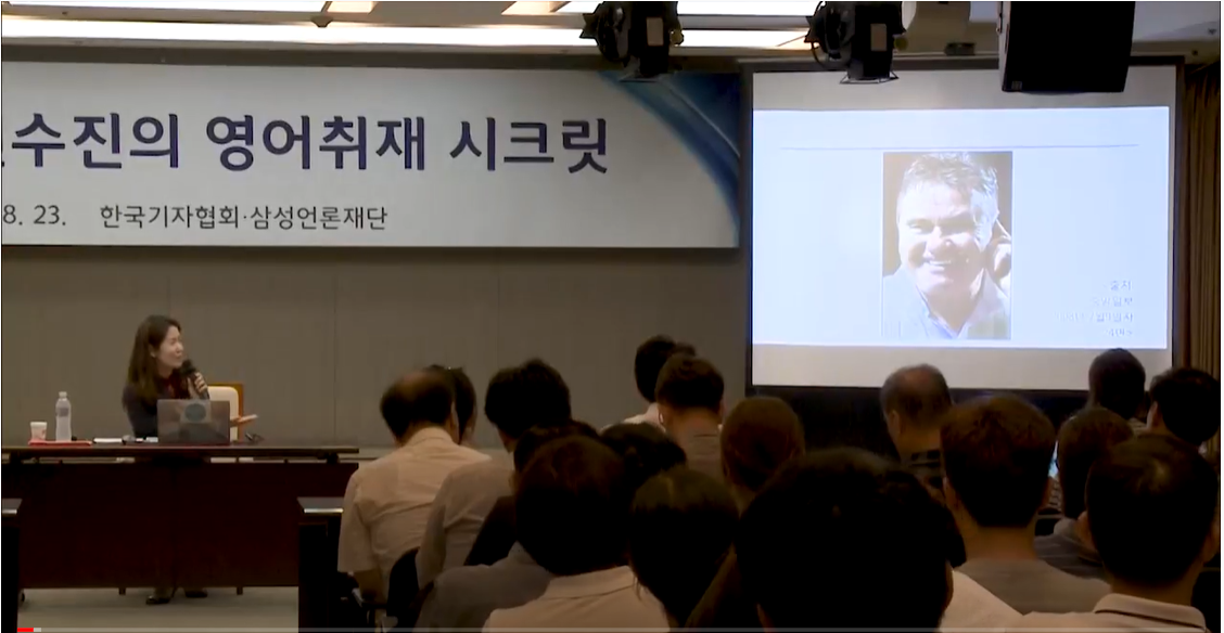 몇 년 전 기자협회에서 초청해주셔서 했던 '토종 영어 취재법' 강연 중. 또 하면 더 잘할 수 있는데! by SJ