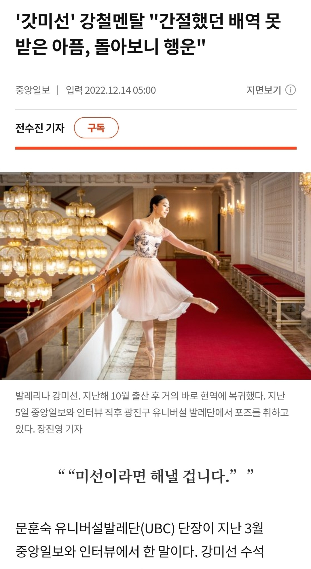 2023년 1월 인터뷰했던 유니버설발레단 강미선 수석무용수의 말이 떠오른다. 마흔이 가까운 나이, 출산 후 복귀를 했을 당시에 대해 물었다. 그의 답.