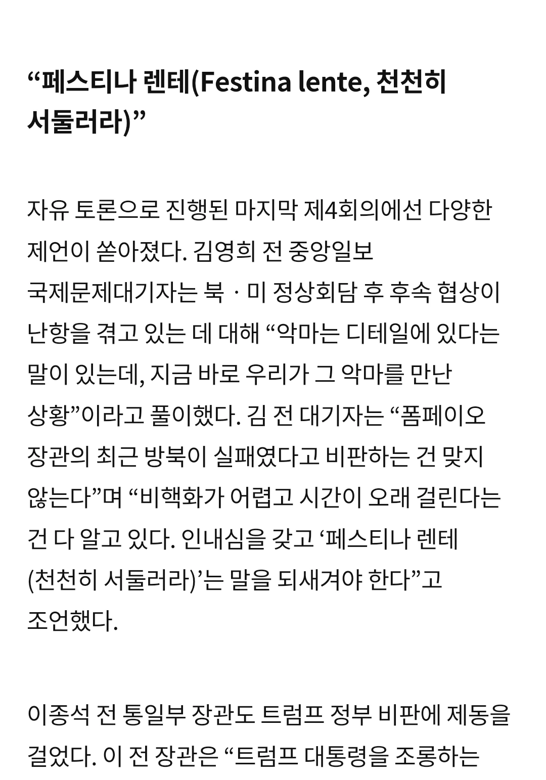 김영희 대기자가 좋아했던 표현이 바로, Festina lente. 주로 대북 정책 관련 맥락에서 한국과 미국 당국에 현안 해결에 시급성을 갖되, 서두르지 말고 면밀하게 일을 추진해야 한다고 주장하기 위해서였다. '제2의 김영희'이자 '여성 김영희'를 한때 꿈꾸었던 나 역시, 그분의 흉내를 내서 아래와 같은 기사를 쓰기도 했었지.