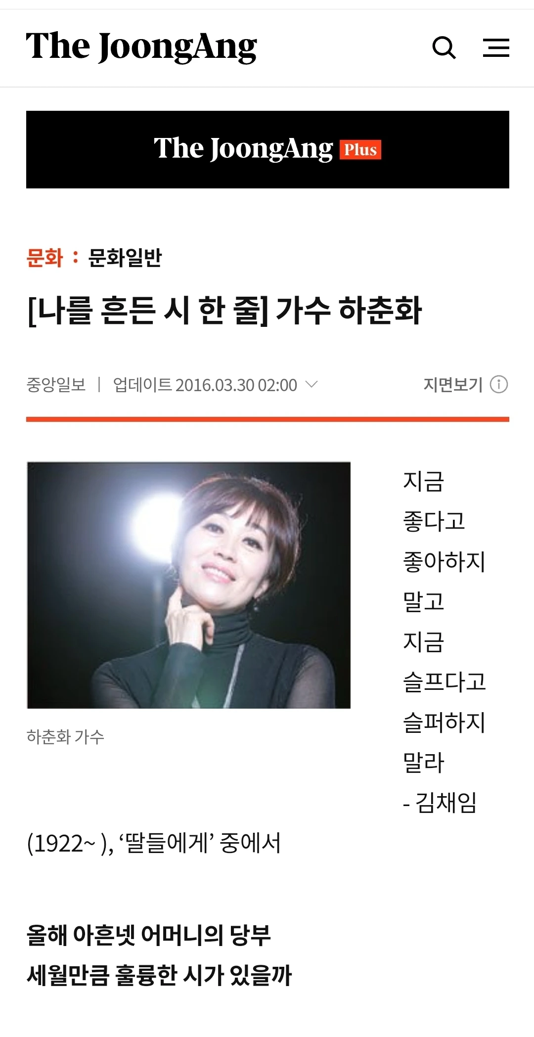 김채임이라는 이름 석자가 귀에 설다면. 당신의 잘못은 아니다. 가수 하춘화 씨의 어머니 성함. 그가 지은 시의 제목은 '딸들에게'였다. 아래 옛 중앙일보 기사 참조.
