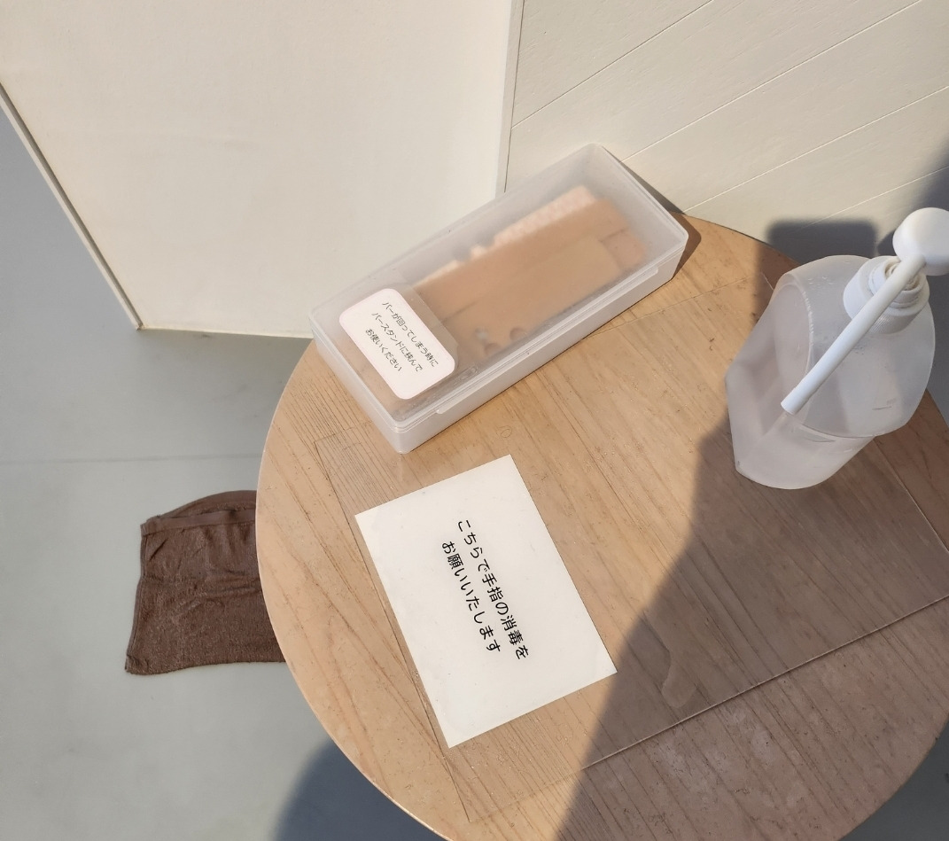 스튜디오 한 켠의 테이블 위엔 소독제 등. 아래에 놓인 갈색 수건이 물 묻히는 용도. by Sujiney