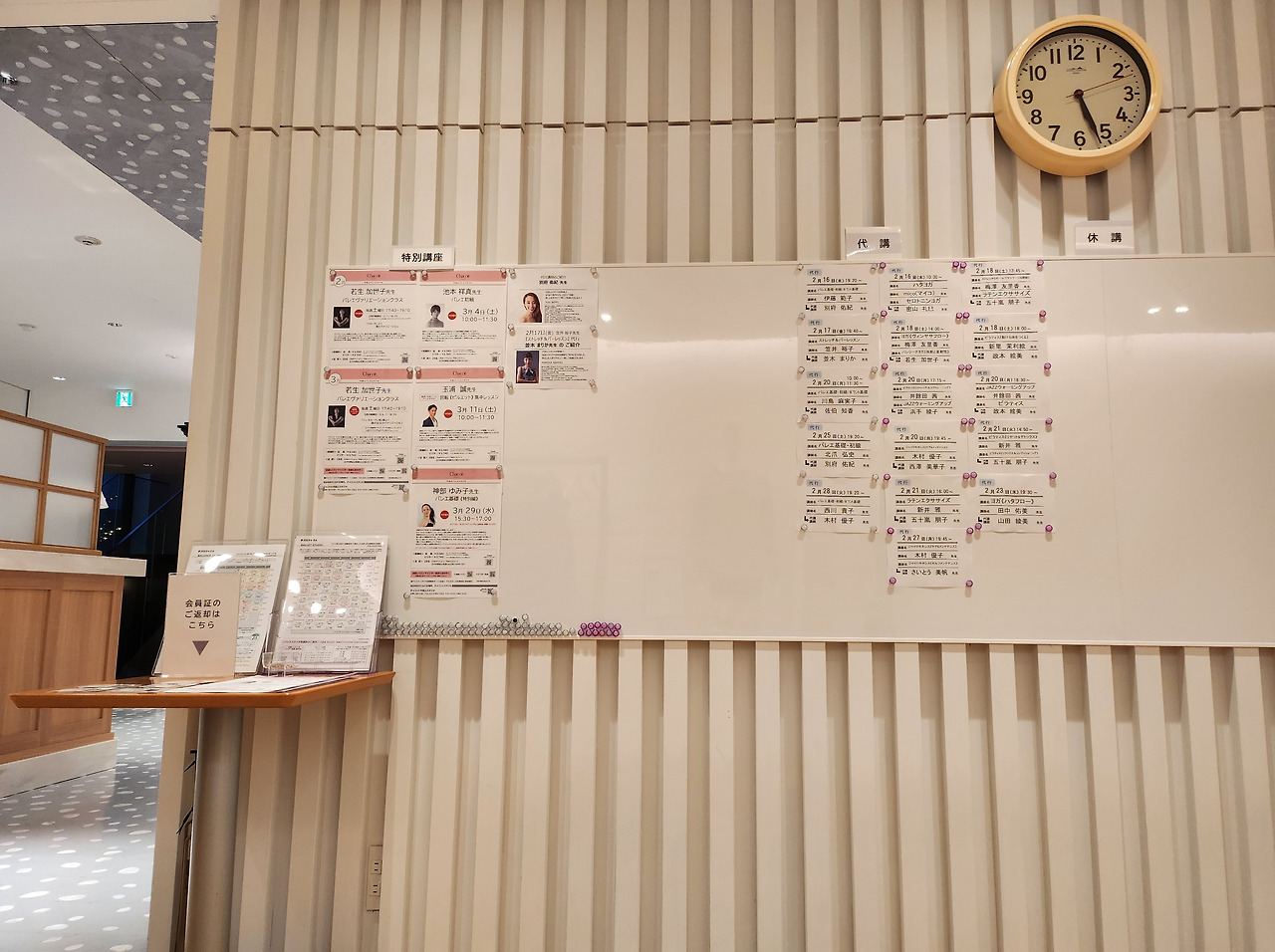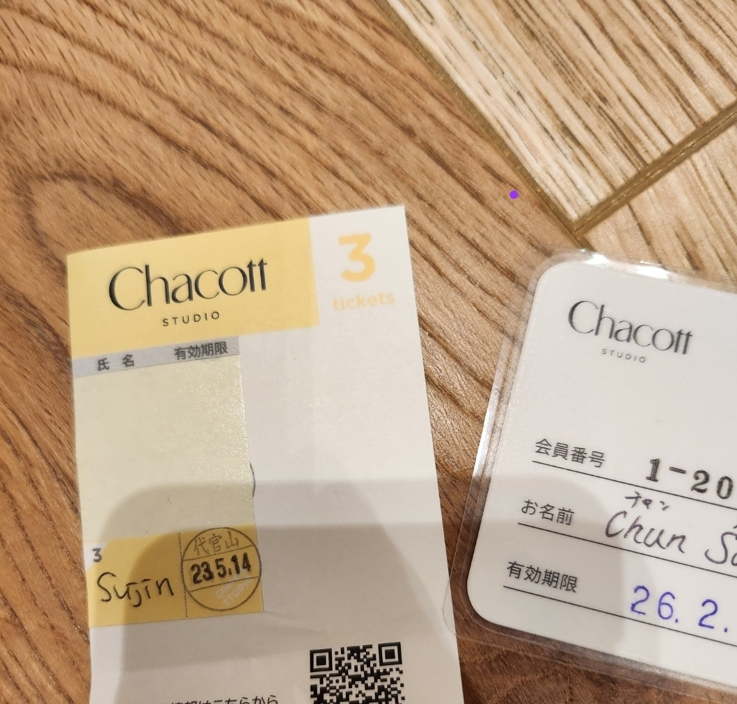 2. 일본은 여전히 아날로그 사회. 차코트 역시 회비를 내고 정식 회원이 되면 아래와 같은 회원증을 만들어주는데, 증명사진을 붙여 이름 등 정보와 함께 코팅해 준다. 접수대에 이 회원증을 내고 클래스를 들으면, 접수처에서 출결 등을 기록한 뒤 스튜디오 밖의 게시판 아래 작은 탁자에 회원증들을 놓아둔다. 클래스가 끝나면 직접 찾아가는 시스템. 그냥 갈뻔했던 적이 여러 번이었다.