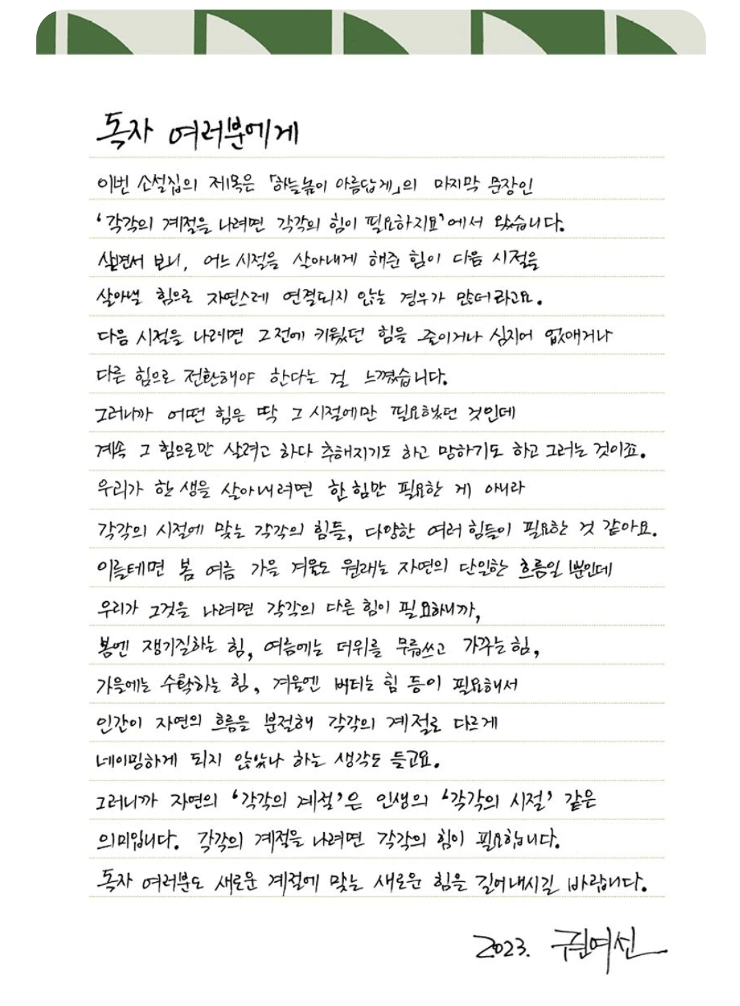 꾹꾹 눌러 필사해 본다. "새로운 계절에 맞는 새로운 힘을 길어내시길." 길'러'가 아닌, 길'어'낸다는 단어를 택한 것도 사무치게 좋다. 역시, 권여선.