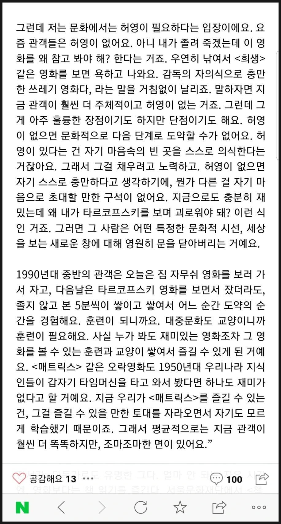 어떤 분야에 교양을 갖추기 위해서는, 약간의 지적 허영과 그로 인한 ‘자발적 괴로움을 감내하는 시간’이 필요하다는 내용이었다. 정신적/물질적 가릴 것 없이 온갖 종류의 허영을 거부하며 살아온 나는, ‘그래서 내 삶의 곳곳에 딥-한 취향이 없음’을 깨닫고 다소 좌절할 뻔 하기도 했다.