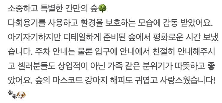 간만의 숲은 '자연 공간'을 통해 '나만의 삶을 균형 있게 찾아가는 사람들'을 위한 라이프스타일 브랜드이다. 그렇게 살아가는 셀러들을 모집했고, 그런 삶을 하루라도 경험하고 싶은 손님들을 우리 숲에 초대했다. 그래서 그런지 리뷰 중 이런 따스한 문구가 가장 기억에 남았다.