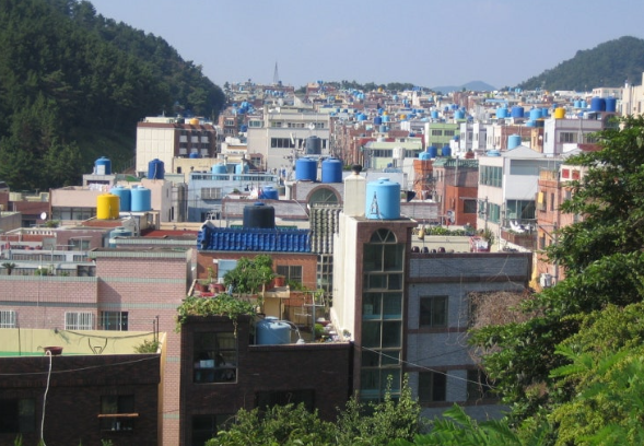 알록달록한 물탱크가 다세대 빌라 옥상 위에 놓여있는 집들이 성냥갑처럼 모여있었다.
