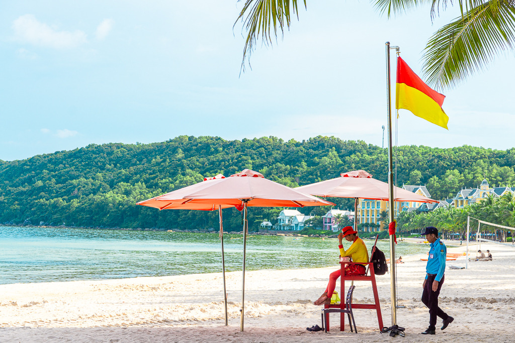 노란색 깃발이 꽂혔다. 바닷속으로 들어가도 된다는 의미다. 매일매일 날씨에 따라 깃발 색이 달라지지만, 보통은 노란색이다. 리조트 앞 해변은 다른 해변과는 달리 관리가 잘 되어 있기도 하고 언제든 시원한 에어컨이 틀어진 방으로 돌아갈 수 있다. 리조트는 수영장을 이용하는 사람들과 바다 쪽 해변을 즐기는 사람으로 나뉜다. 푸꾸옥은 수심이 완만하고 경사가 급하지 않아 비교적 안전하게 물놀이를 즐길 수 있는 바다다.