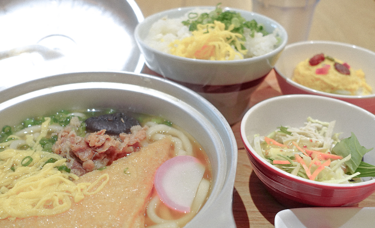 마쓰야마 명물 요리라고 할 수 있는 도미밥과 우동이 포함된 세트 정식으로 주문했다. 1200엔. 고급진 분위기의 레스토랑에서 먹는 도미밥은 어떨지 모르지만, 단품 주문 시 300엔인 도미밥을 우동 2가지 샐러드와 함께 제공되는 정식으로 결정했다. 주문 단계에서 양을 선택할 수 있었지만 보통으로 했다.