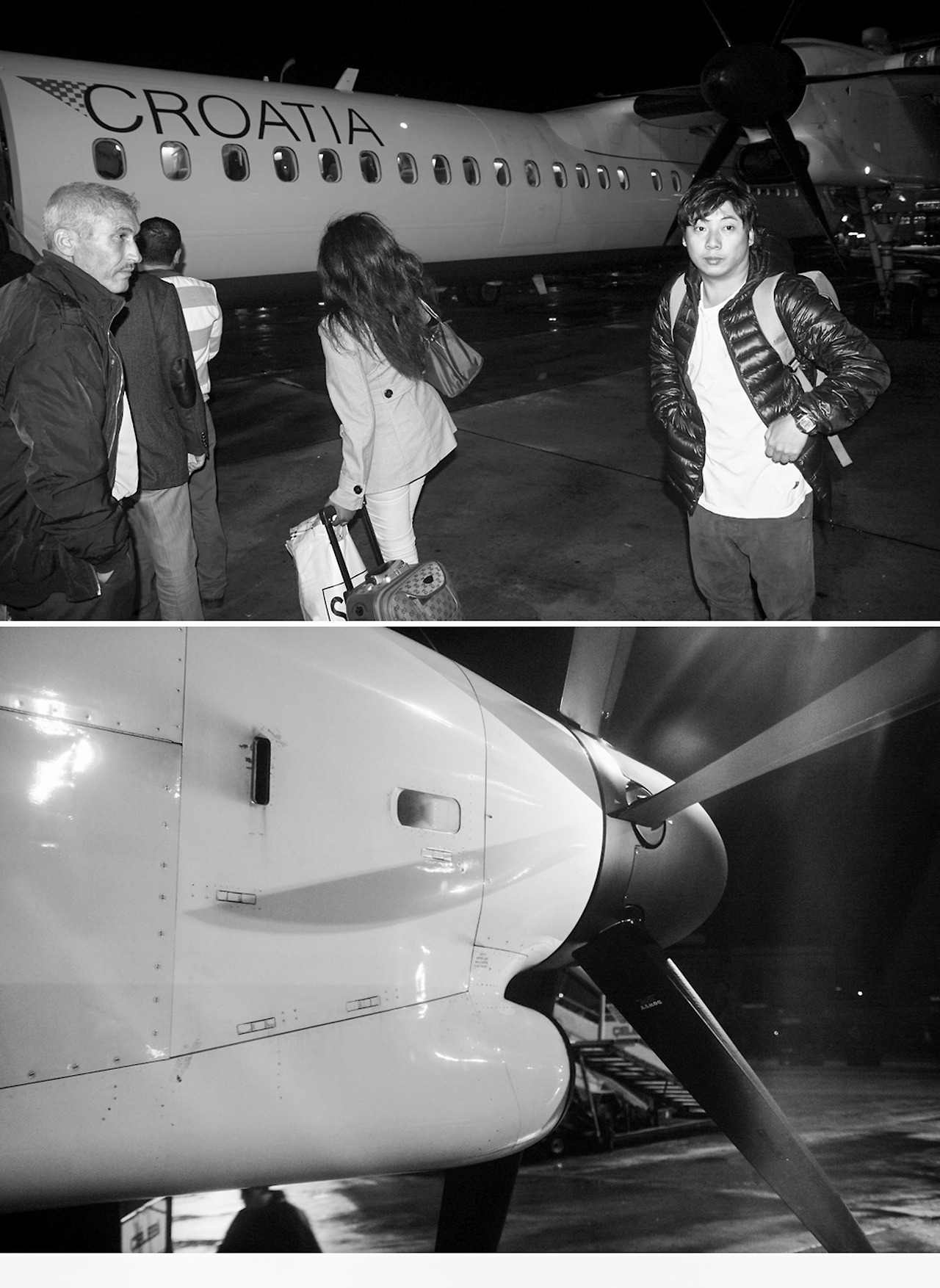 실로 오랜만에 프로펠러가 달린 소형 비행기를 타 본다. 늦은 밤 어두운 활주로의 조명은 크로아티아를 상징하는 붉은 체크무늬를 정확히 비추고 있다. 가늘게 내리는 빗방울이 점퍼에 맺힌다. 내리는 비를 고스란히 맞으며 비행기에 탑승했다.