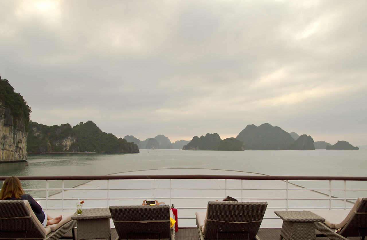 하롱베이의 아침 : 1박 2일의 하롱베이 크루즈를 선택한 가장 큰 이유는 바로 선상에서 맞이하는 아침때문이었다. 전날 해넘이도 좋았지만 무엇보다 아침을 보고 싶었다. 나만 그렇게 느끼는 것이 아니었나 보다. 선상, 갑판 등 거의 모든 곳으로 사람들이 나와있었다. 해가 뜨기엔 다소 이른 시간, 선상 한쪽에서는 선원들이 아침 식사를 준비하고 있었다. 따뜻한 커피 한 잔을 들고 테라스에 자리를 잡고 앉았다. 조금씩 밝아지는 하늘과 어둠 사이로 모습을 드러내는 풍광들이 신비롭게만 느껴졌다. 해가 떠오르기 시작하자 하롱베이는 몽환적인 분위기로 변하고 있었다. 일출 풍경만큼이나 크루즈에서의 조식도 잊을 수 없다. 답답한 호텔 조식당이 아닌 파노라마처럼 펼쳐진 하롱베이를 바라보며 먹는 조식이라니. 다시 떠올려도 행복한 순간이다.