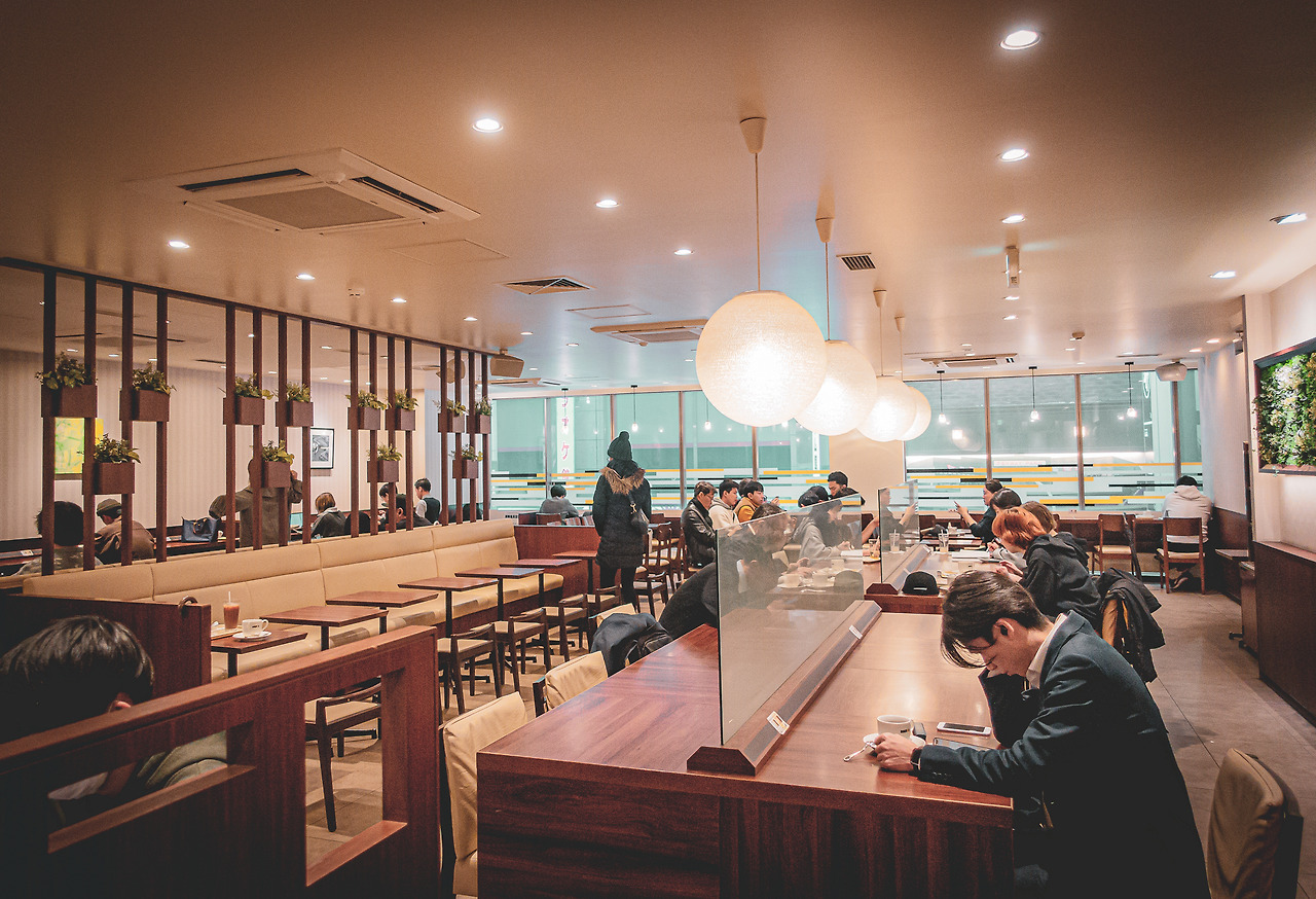 여전히 촌스럽지만 낭만 가득한 풍경이 펼쳐진다. 비록 맛집 인증 셀카는 찍을 수 없지만 사라진 줄 알았던 조간신문을 읽으며 시간을 보내는 노인들, 잠시 쉬어가는 세일즈맨, 깊은 담배 연기를 내뿜는 젊은이들까지. 다행히 흡연실이 생겨 연기가 밖으로 새어 나올 일은 없다. 길고 가느다란 카운터 테이블에 한 사람씩 노트북을 켜놓고 작업, 공부하는 사람도 많다. 너무나도 평범한 풍경에 나도 잠시 폰을 넣고 추억에 빠져본다. 뜨거운 카푸치노 한잔이 식기도 전에 토스트를 다 먹었버렸다. 미지근해진 커피를 마저 마시고 나왔다. 그사이 맛집 앞에 줄도 조금 줄었지만 식사를 하기엔 무리. 그렇다. 맛집엔 사람이 많다.