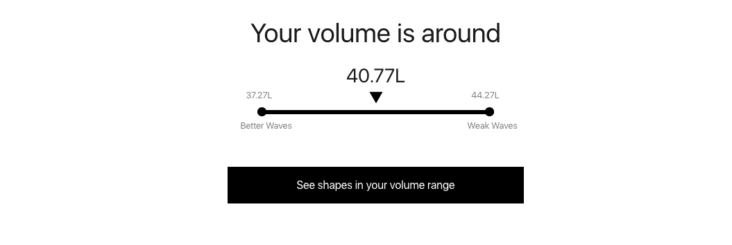 이게 저한테 맞는 최소한의 볼륨이라고 보면 돼요.여기서 Better wave (좋은 파도) 컨디션에서는 37.27 Weak wave (약한 파도)에서는 44.27 의 볼륨이 각각 나오니, 이 볼륨을 참고로 보드를 선택하면 큰 도움이 됩니다.
