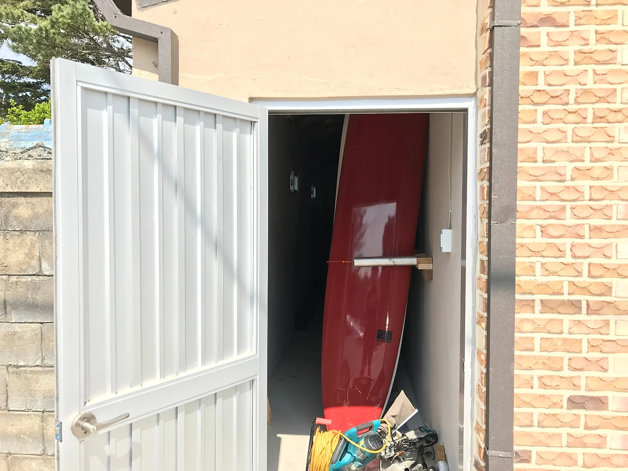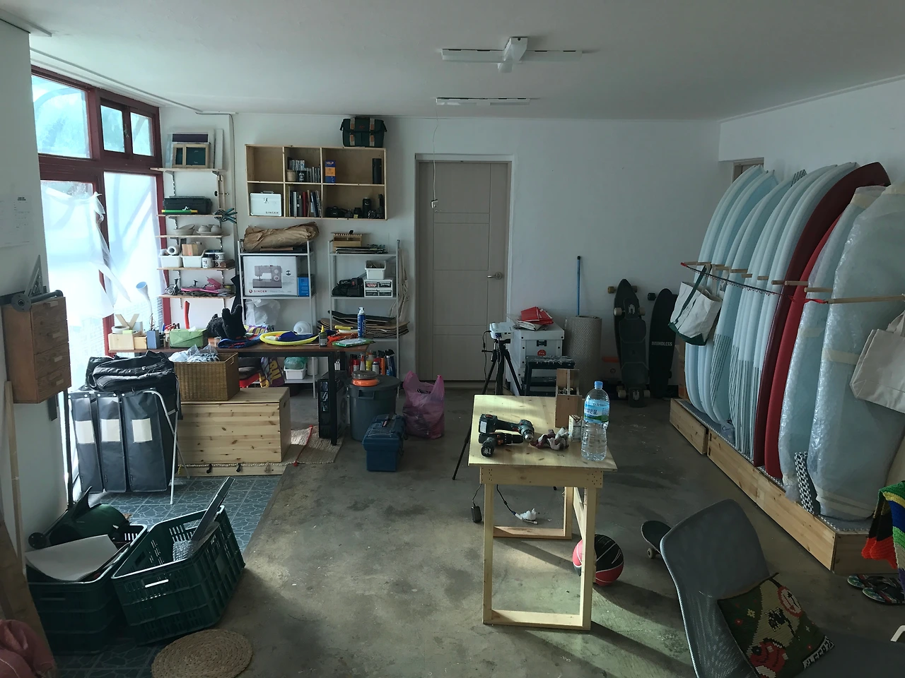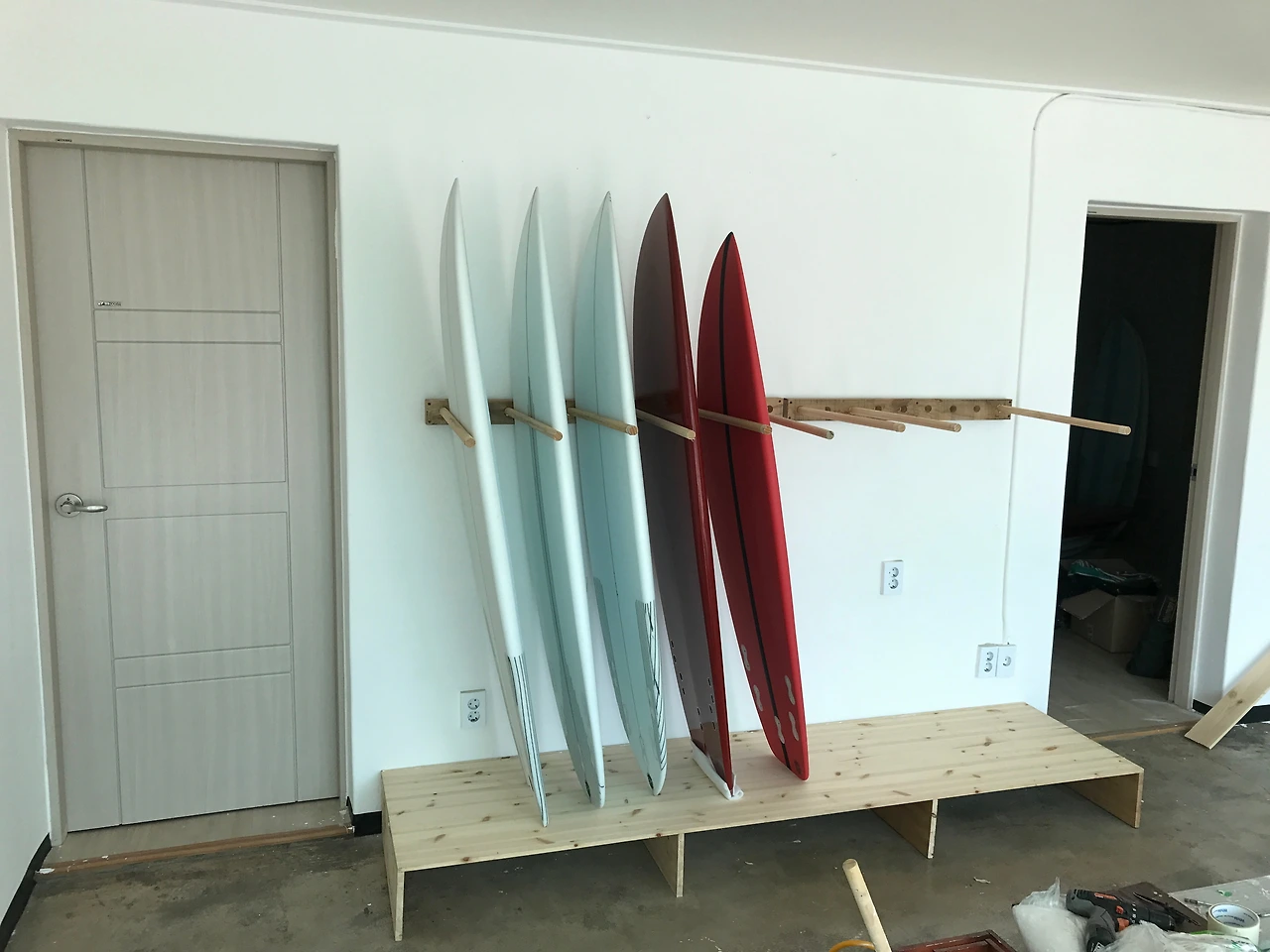 일단은 제일 급한 서프보드 거치대를 집에 남아있던 나무들과 집주인 아저씨가 모아두신 팔레트 나무를 활용해 만들었다. 초창기에 급하게 만든 거라 부실하고 볼품없었지만, 그래도 1년 가까이 제 몫을 하고, 지금은 새로운 형태의 거치대로 바뀌었다.