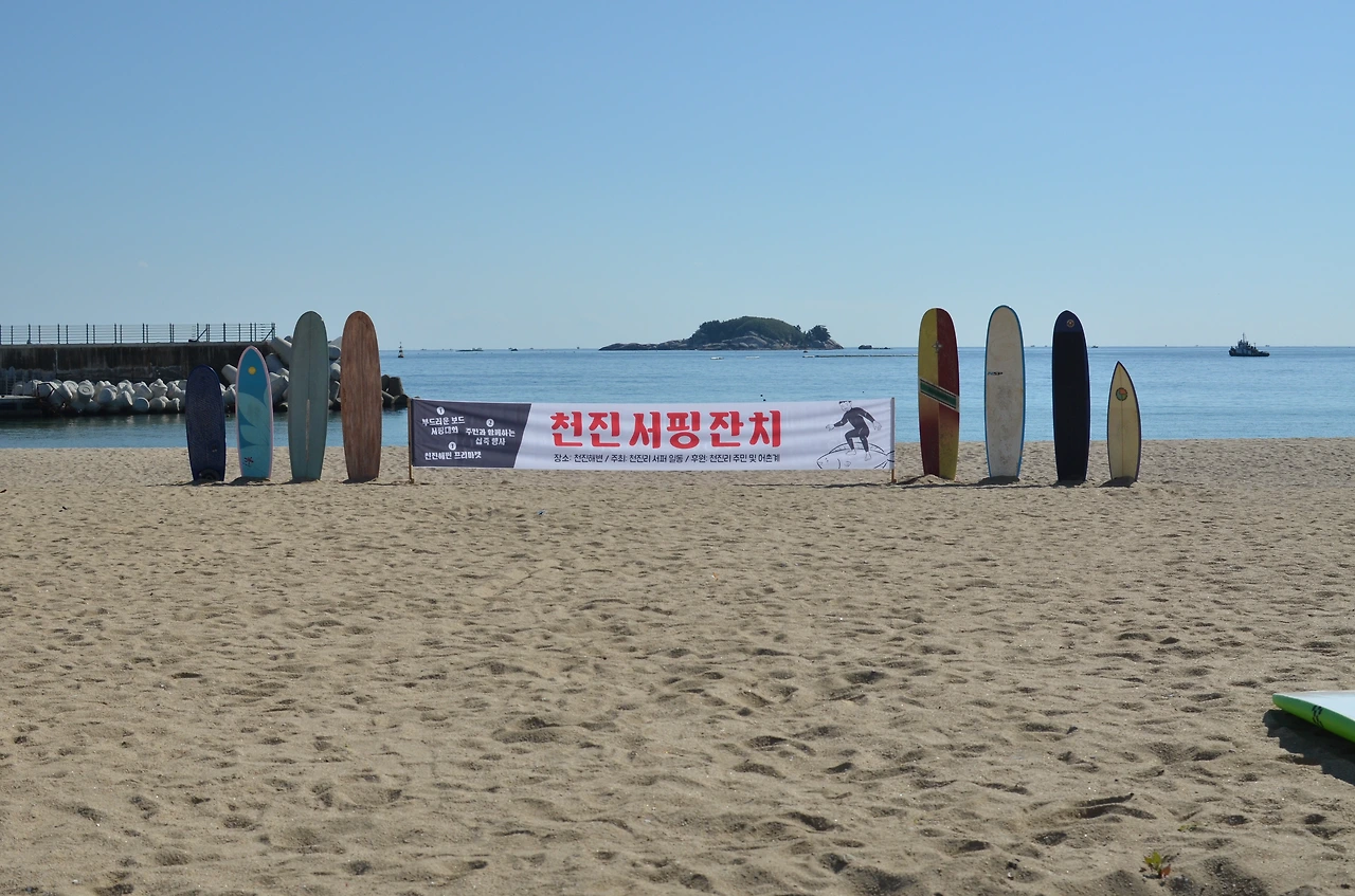 양양을 중심으로 커지던 서핑 시장이 점점 포화상태로 치닫고, 이를 피해서 넘어온 조용한 성격의 서퍼들이 이곳에 자리를 잡으며 천진에도 작은 서핑 교습소가 생겼다. 그리고, 이곳을 베이스로 서핑을 즐기는 친구들이 하나둘씩 모이고, 2017년에는 우리를 포함해서 총 4개의 서핑숍이 생겨났다.