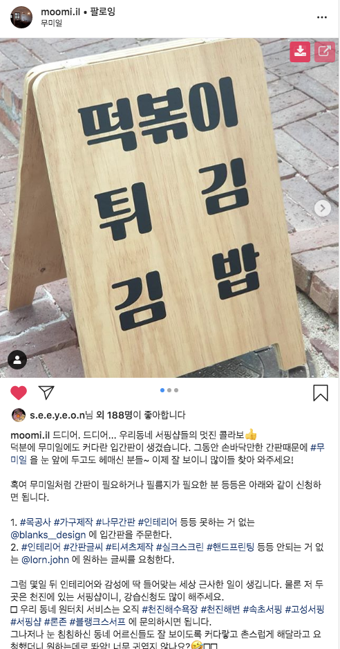 아, 간판을 만들었더니 동네 1등 분식점, 아니 강원도 북부권역에서 제일 유명한 분식점인 무미 일에서 간판 제작을 의뢰해 주셨다. 이 집의 목적도 단순하다. 가게가 이쁘장하고, 귀엽다 보니 카페인 줄 알고 들어오시는 분들이 꽤 계신가고 한다. 그래서 정체성을 명확하게 하기 위해 입간판을 만들고 떡볶이, 튀김, 김밥 이렇게 메뉴만 적어 두셨다.